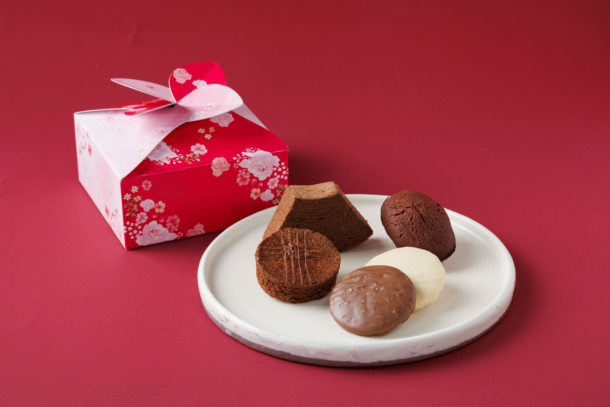 セット内容:ショコラフィナンシェ1個/ショコラチーズバウム1個/ガレットショコラ1枚/御用邸ホワイトショコラチーズクッキー1枚/御用邸ミルクショコラチーズクッキー1枚