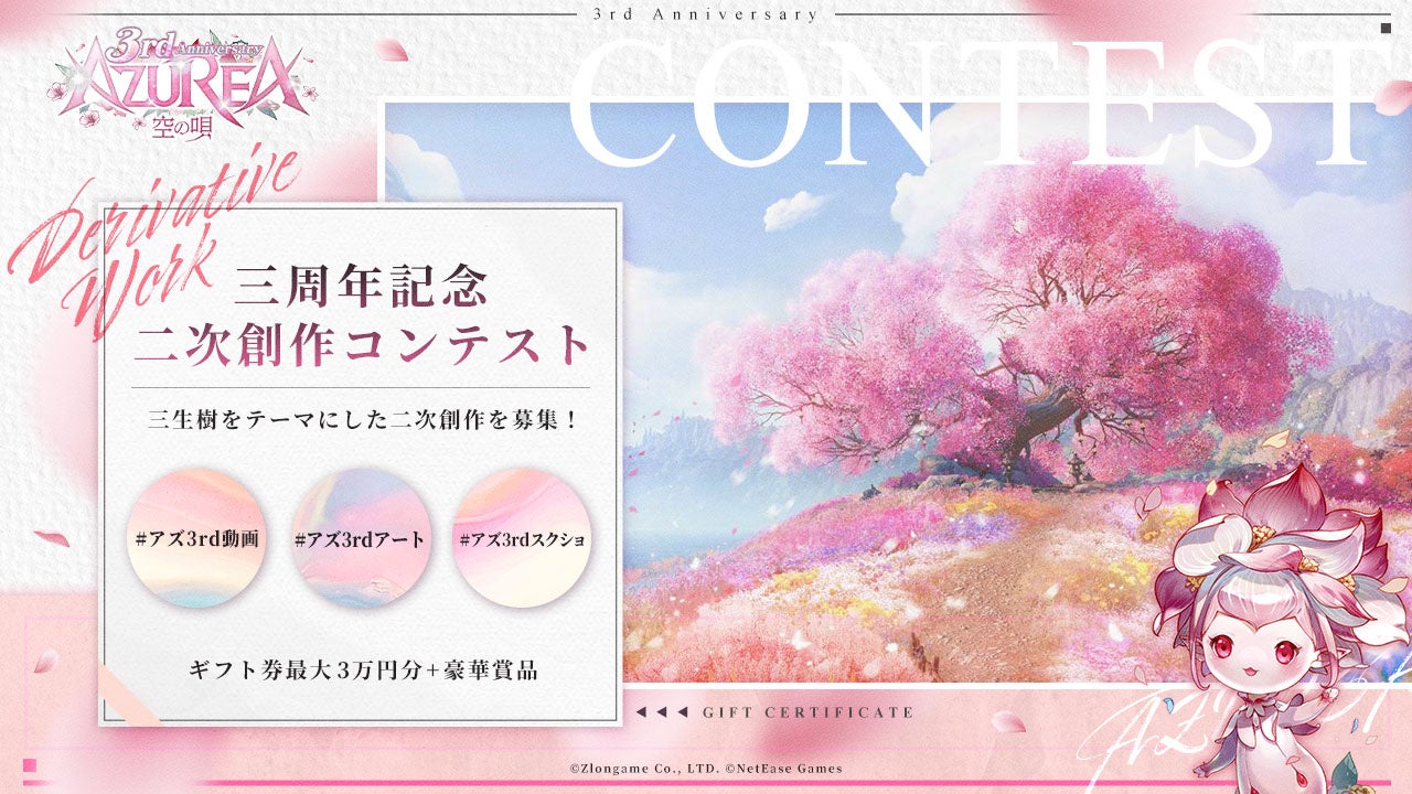また3月3日(月)から実施されている「二次創作コンテスト」は、三生樹の二次創作をテーマに“スクリーンショット部門”、“動画部門”、“アート部門”の3部門で募集。4月20日(日)の締切後、4月30日(水)に受賞者が発表されます。受賞者にはギフト券に加え、アズレアを身近に感じられる景品をプレゼント。受賞者一覧は公式サイトのお知らせページから確認できます。