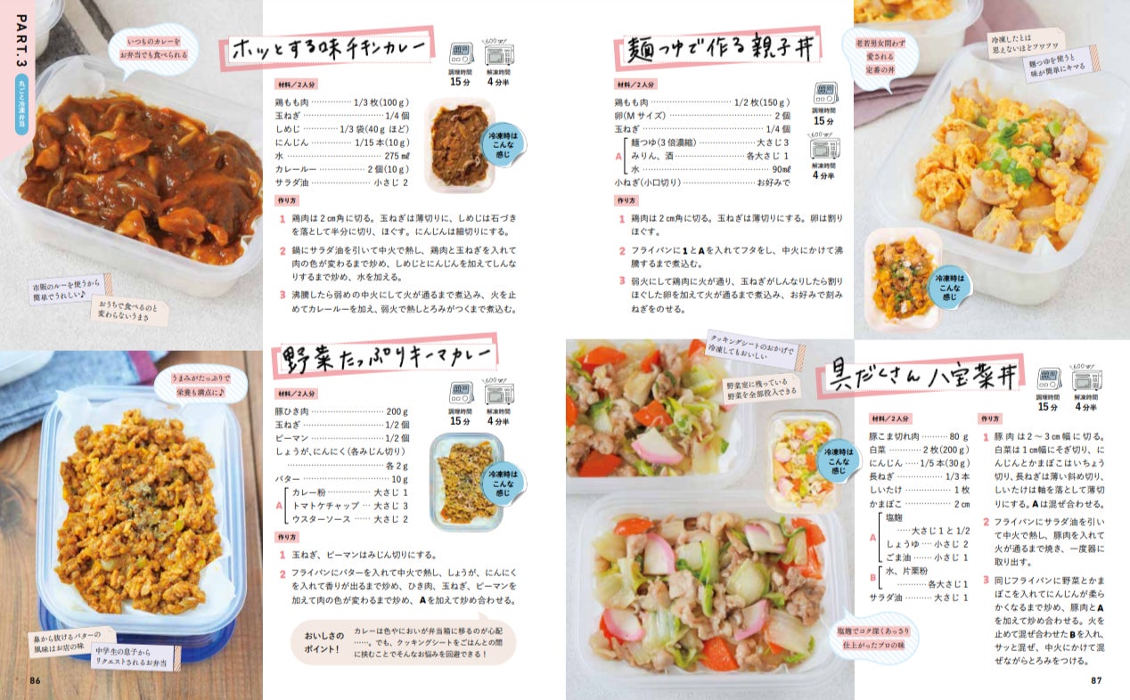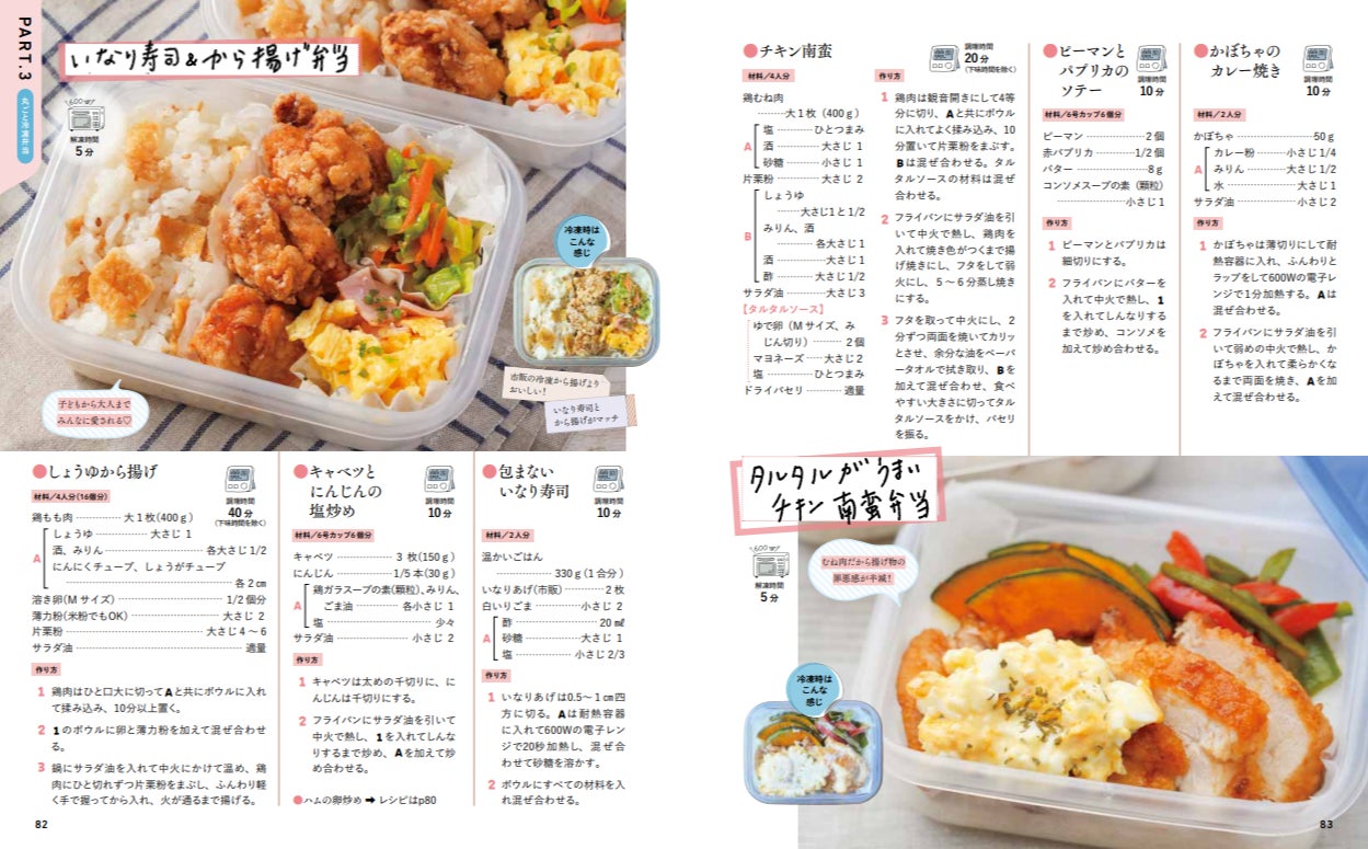 新刊では好きな量・献立を自由に決められる「冷凍作りおき弁当」と温めるだけで食べられる「丸ごと冷凍弁当」の2パターンを収録し、 前作を超える219品のレシピを掲載しています。忙しい朝のお弁当作りはもちろん、留守番中の子どもへの置き弁、ひとりランチ、小腹がすいたときのおやつなど、さまざまなシーンで大活躍すること間違いなしです。