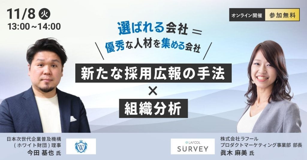 本セミナーでは、「ホワイト企業認定」を展開する一般財団法人日本次世代企業普及機構 理事 今田氏と組織改善ツール『ラフールサーベイ』を提供するラフールの眞木が新しい採用広報における人事戦略と、優秀な社員が組織になじんで定着し、健康的に活躍するための具体的なケア方法について、講義形式でお話します!