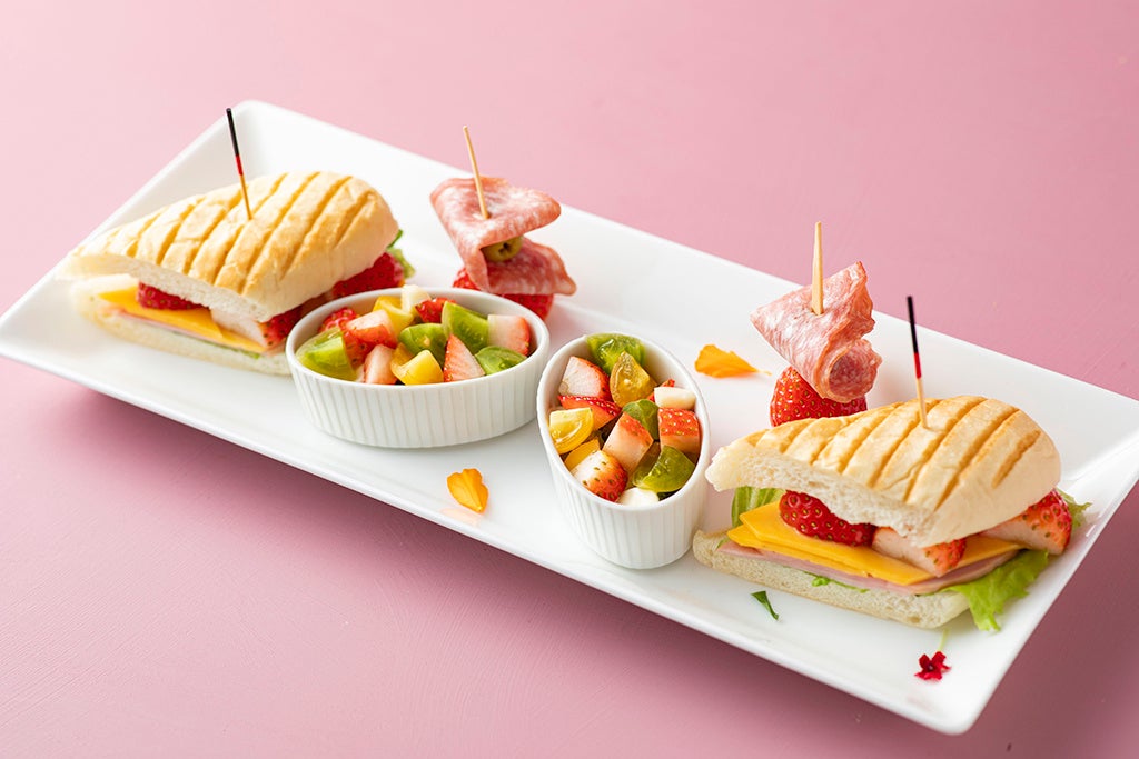 苺とハム・チェダーチーズのパニーニ、苺とカラフルトマトのカプレーゼ、苺とサラミのピンチョス