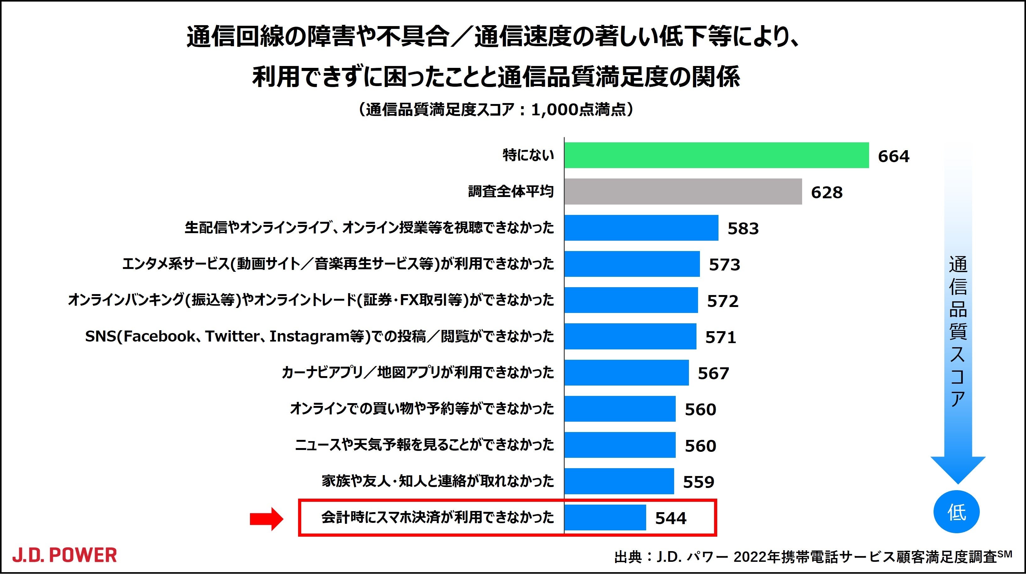 通信障害時の不具合経験で、通信品質満足度が最も低下するのは「スマホ決済」