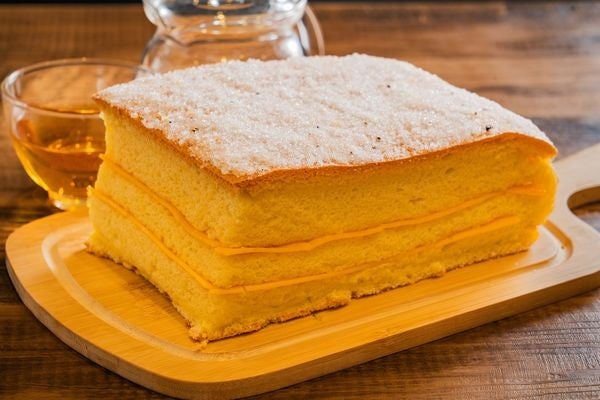 台湾カステラは、台湾で古くから親しまれている家庭的なスイーツで、その場で焼き上げるケーキという意味の「現烤蛋糕(シエンカオダンガオ)」と呼ばれています。大きくカットされ、フワフワの食感とほんのりした甘さは、おやつだけでなく朝食などにもぴったりです。