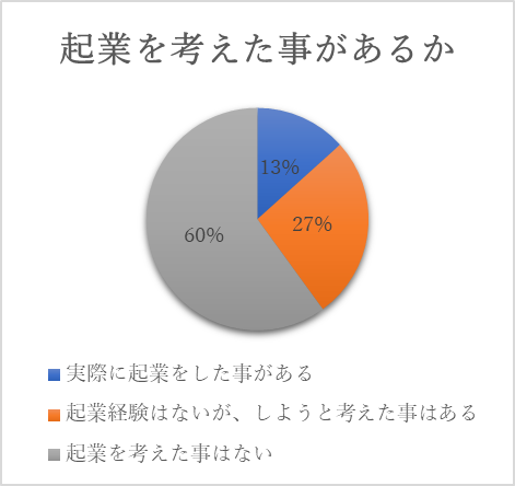 これまでの起業経験や企業検討経験について質問をしたところ、全体の13%が「起業をした事がある」、27%が「起業しようと考えた事がある」と回答。また、今後の起業意志に関する質問については全体の過半数が将来起業を考えている旨の回答をしました。