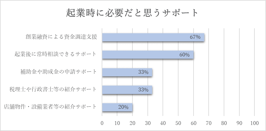 スタートアップ段階において必要度が高いサポートを問う質問(※複数回答可)について、回答者の約67%が「創業時の資金調達支援」、約60%が「起業後に常時相談できるサポート」を回答しました。
