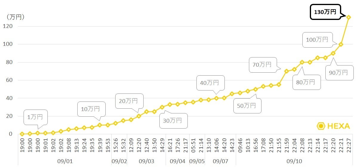 9/1(金)19:00からスタートしたオークションは初日から14件の入札があり、101,000円まで値上がりし、9/2(土)には150,001円、9/3(日)には300,000円、9/4(月)には350,000円まで値を上げました。その後、9/5(火)に380,000円の入札、9/7(木)に450,000円の入札がありました。そして、最終日9/10(日)には、終了5分前の入札が複数回あり、5分の自動延長が繰り返され、最終的に22:27の1,300,000円の入札でオークションが終了いたしました。