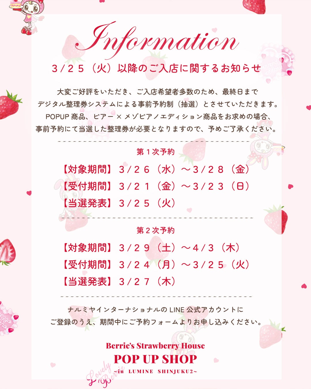 3/20(木・祝)~3/25(火)のご入店につきましては事前予約が終了しておりますのでご了承ください。3/26(水)からの入店につきましては以下をご参照のうえ、お申し込みください。
