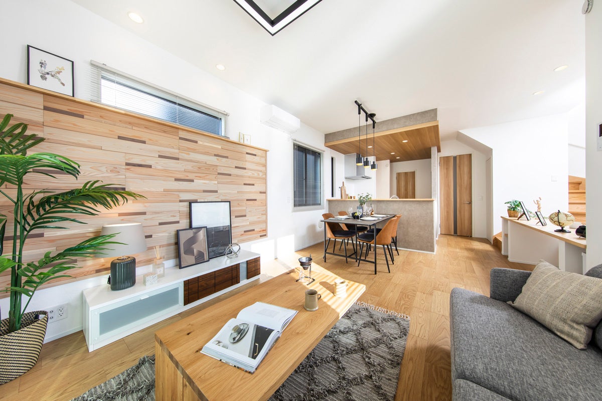 リビングの一部の壁には、木の素材感を活かし、ぬくもりや味わいを感じられる「無垢材アクセント壁パネル「せせら木」を採用しました。空気をきれいに保ち、気分を和らげる杉材は、空気清浄効果やリラクゼーション効果が期待できます。