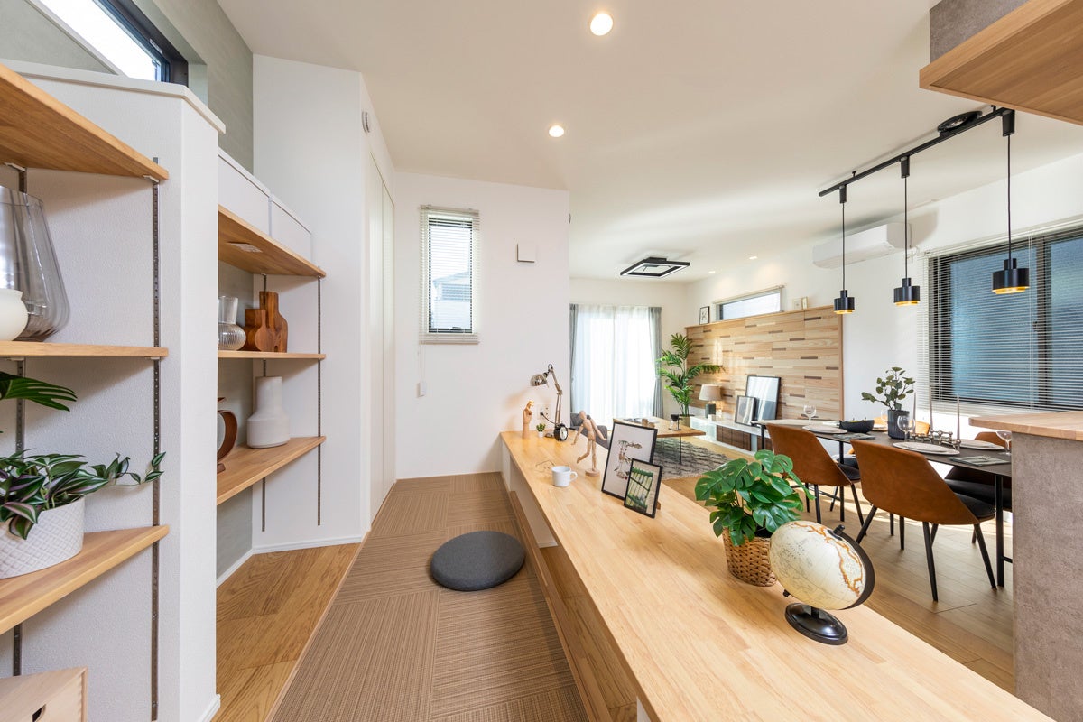 リビングやダイニングの家族とつながる小上がりの空間を設えたスキップDENには、カウンターを設置しました。テレワークや読書、勉強スペースとしても利用でき、家族と会話を楽しみながら過ごせます。DENには高さ調節のできるシェルフも備えています。