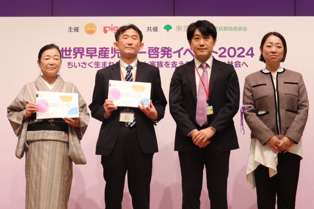 イベントを記念して行われたフォトセッションと贈呈式には、日本NICU家族会機構(JOIN)、ピジョン株式会社、東京都、(公社)東京都助産師会の4団体が参加しました。