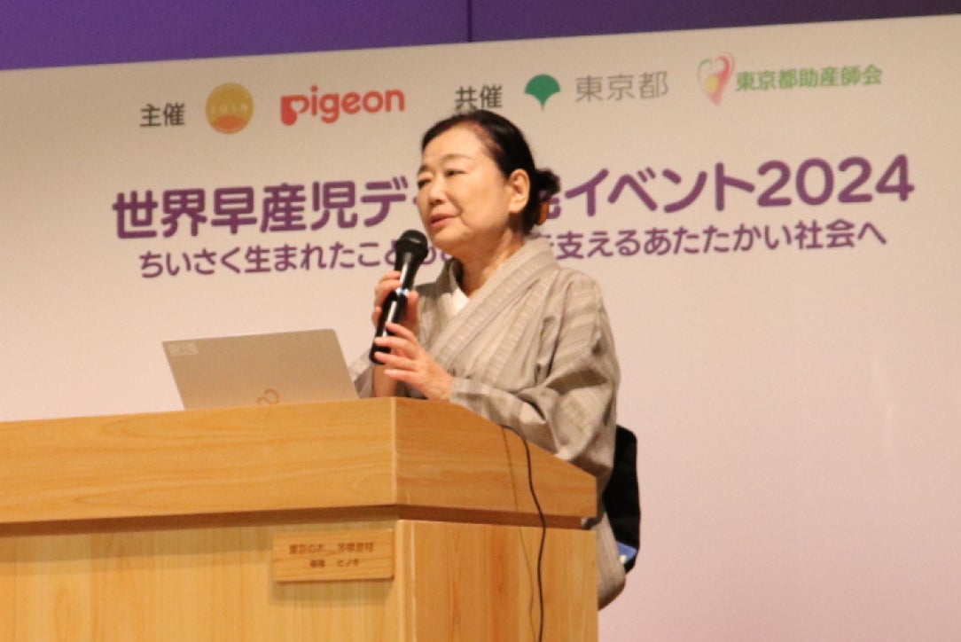 東京都助産師会 会長 宗先生は講演の中で「退院した後のお母さんと赤ちゃんご家族を地域で見守っていく産後ケアがより普及することを願います」などと早産を経験した母親に対する産後ケアの重要性を語られました。