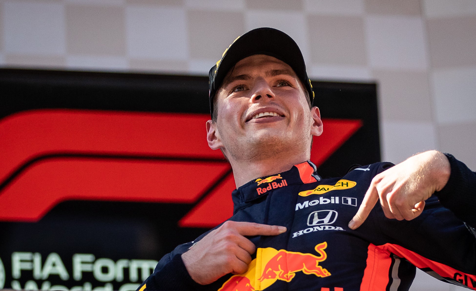 シーズン初優勝を飾り、表彰台で Honda への感謝を示すマックス ・フェルスタッペン