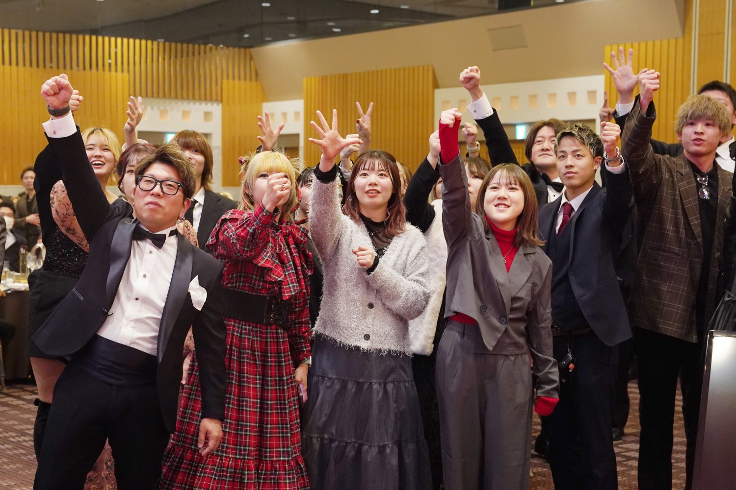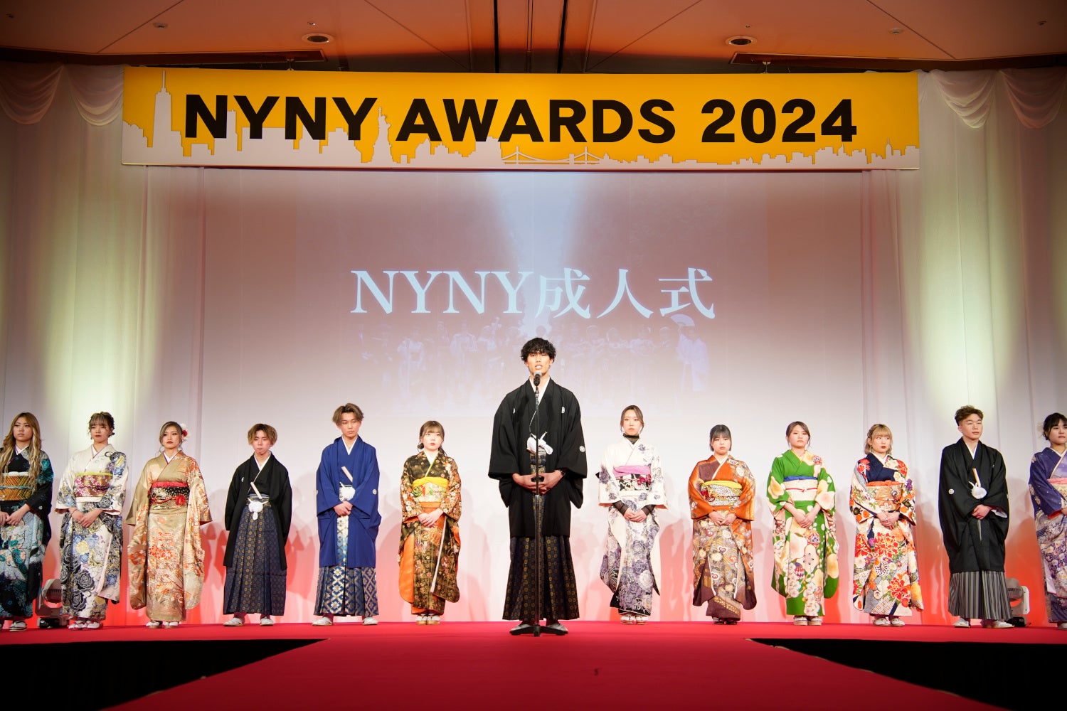 「NYNY AWARDS」の当日は、20歳になったスタッフが先輩にヘアアレンジと着付けをしてもらい、晴れ姿で来場します。新成人スタッフを舞台で紹介し、事前に前撮りしてある写真やムービーの上映・記念品の贈呈・新成人代表の挨拶などを行います。新成人のご家族にも晴れ姿を届けるため、記念写真撮影も実施します。