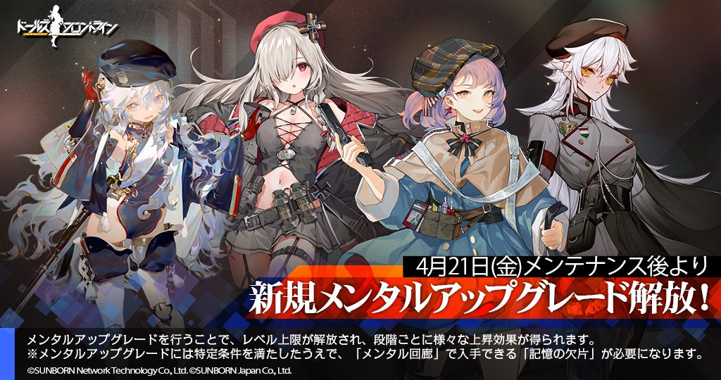 株式会社サンボーンジャパンは、スマホ向け戦略型シミュレーションゲーム『ドールズフロントライン(以下、「ドルフロ」)』において、キャラクターに新たな力を与える“メンタルアップグレード”の対象に「Gr G36c」などの4名のキャラクターが追加されることをお知らせいたします。