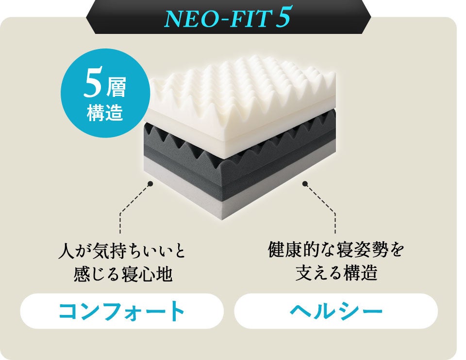 エムール独自の5層構造『NEO-FIT5(ネオフィット・ファイブ)』は、これまで両立が難しいと考えられてきた「コンフォート」と「ヘルシー」を高次元で両立させた中材構造です。