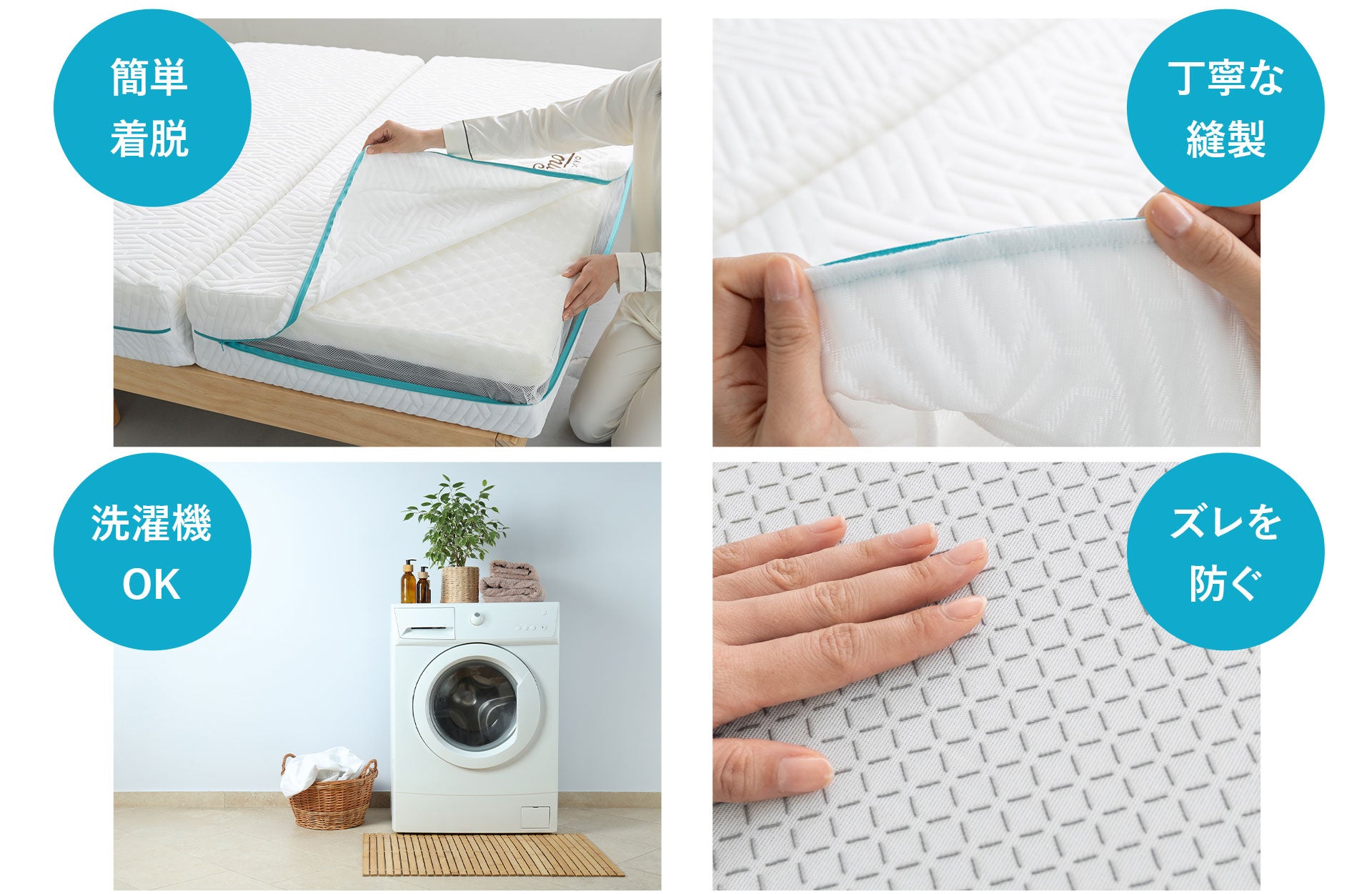 アウターカバーと中材の摩擦を軽減するメッシュインナーと大きく開くコの字ファスナーで、着脱が簡単。また、ファスナー裏の丁寧な縫製により、美しい見た目とアウターカバーの耐久性を実現。アウターカバーはご家庭の洗濯機で洗えるため、いつでも清潔にお使いいただけます。