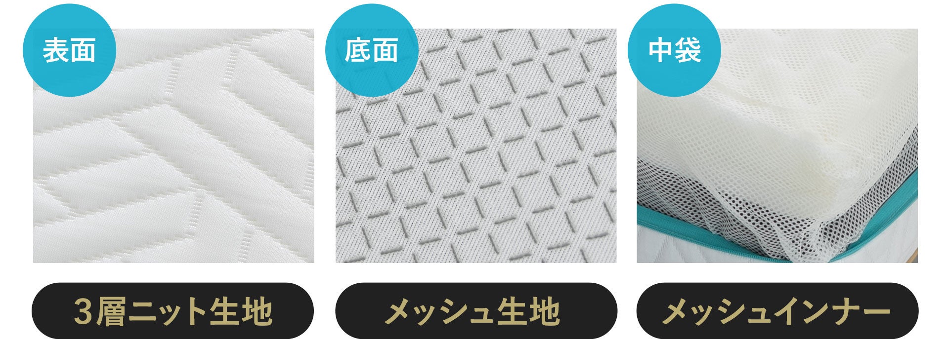 ■側生地 表・側面:ポリエステル100% 3層ニット生地 裏面:ポリエステル100% メッシュ滑り止め生地 インナーカバー:ポリエステル100% メッシュ生地(縫い込み式) ■中材 [頭・脚部分] 1層目:高弾性ウレタン 35D 150N (厚さ:約5㎝) プロファイル加工 2層目:高弾性ウレタン 35D 150N (厚さ:約3㎝) フラット 3層目:高反発ウレタン 30D 190N (厚さ:約5㎝) プロファイル加工 4層目:高反発ウレタン 30D 190N (厚さ:約3㎝) フラット 5層目:超高反発ウレタン 35D 260N (厚さ:約4㎝) フラット [腰部分] 1層目:高反発ウレタン 32D 220N (厚さ:約5㎝) プロファイル加工 2層目:高反発ウレタン 32D 220N (厚さ:約3㎝) フラット 3層目:高反発ウレタン 30D 190N (厚さ:約5㎝) プロファイル加工 4層目:高反発ウレタン 30D 190N (厚さ:約3㎝) フラット 5層目:超高反発ウレタン 35D 260N (厚さ:約4㎝) フラット |