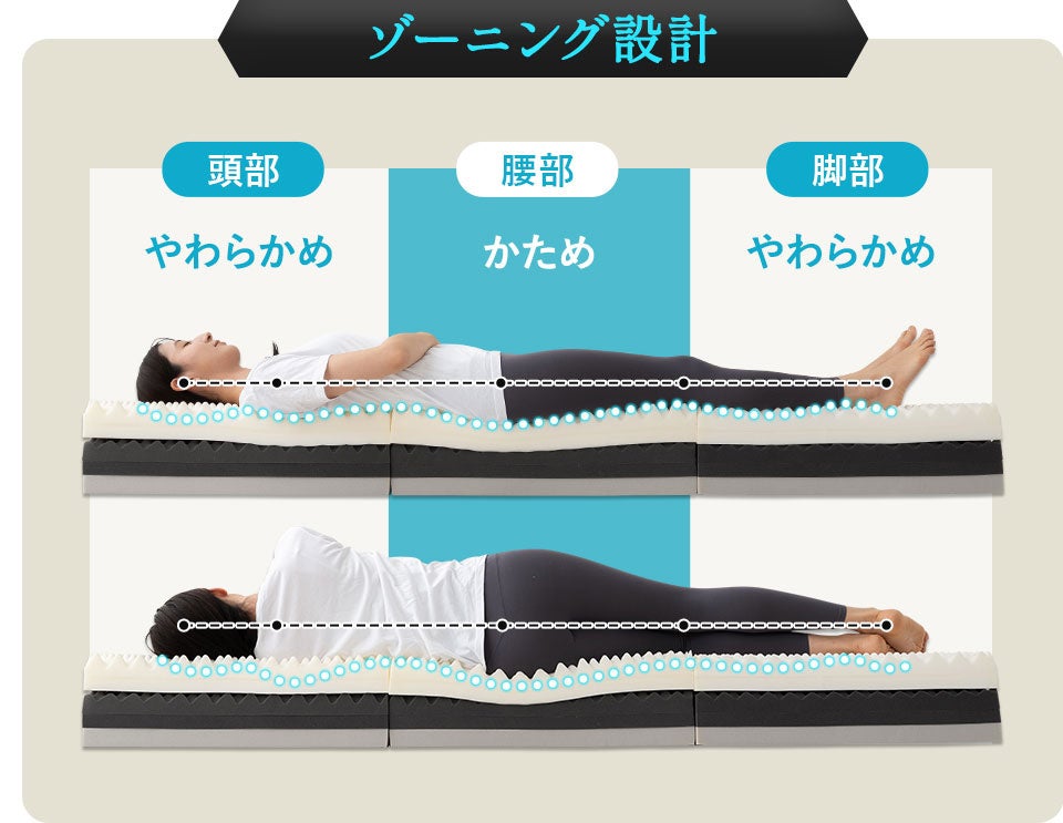 頭・腰・脚それぞれで硬さと密度を変化させたゾーニング設計を採用。