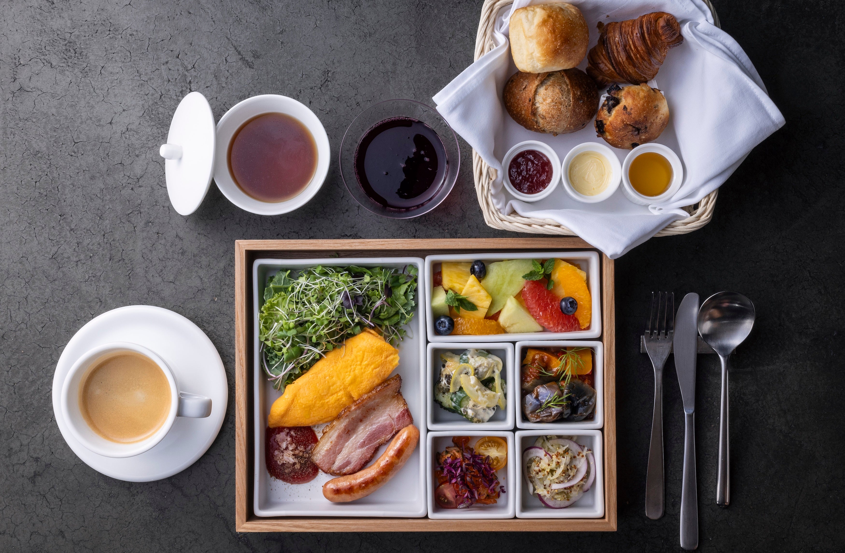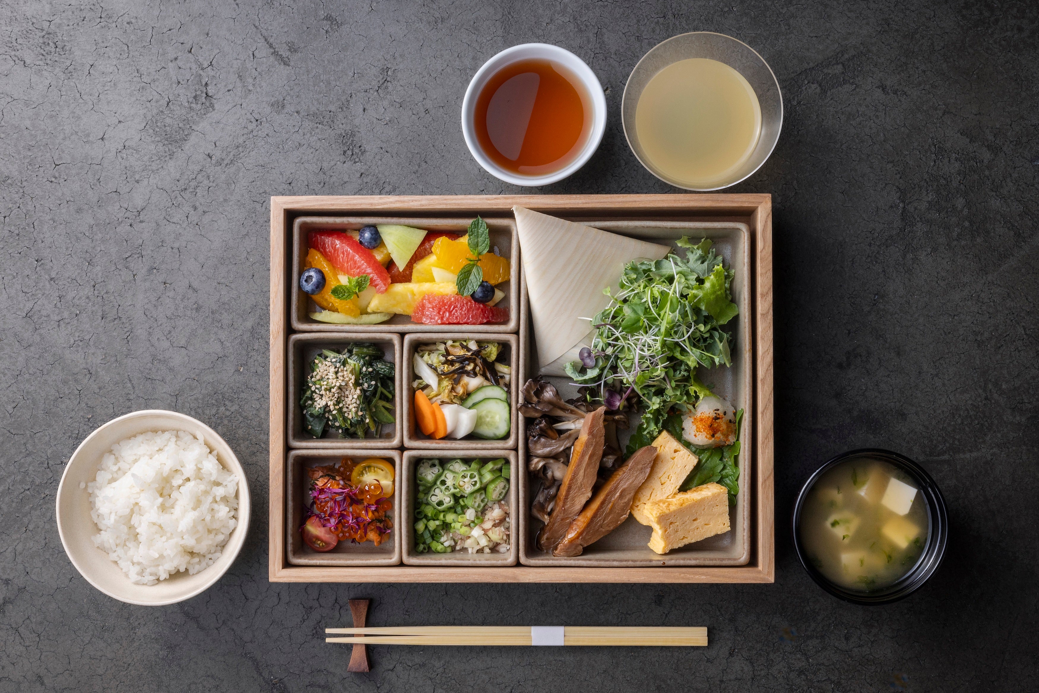 🔸トップライトから光が注ぎ込む、アートと植栽に囲まれた吹き抜け空間「the LOUNGE」で白井屋の「群馬の朝ごはん」をお召し上がりいただきます。シェフの幼少期の思い出いっぱいの朝食、フランス修行時代に思いをはせた和食からお選びください。