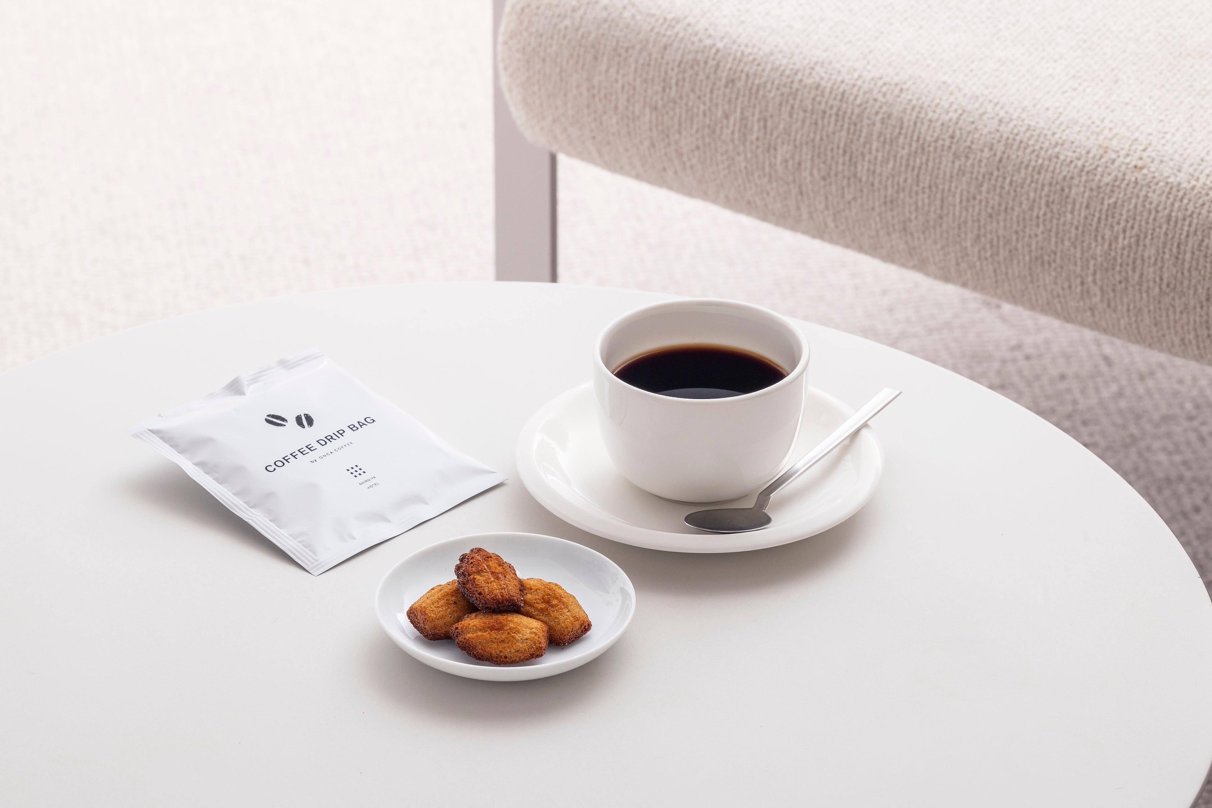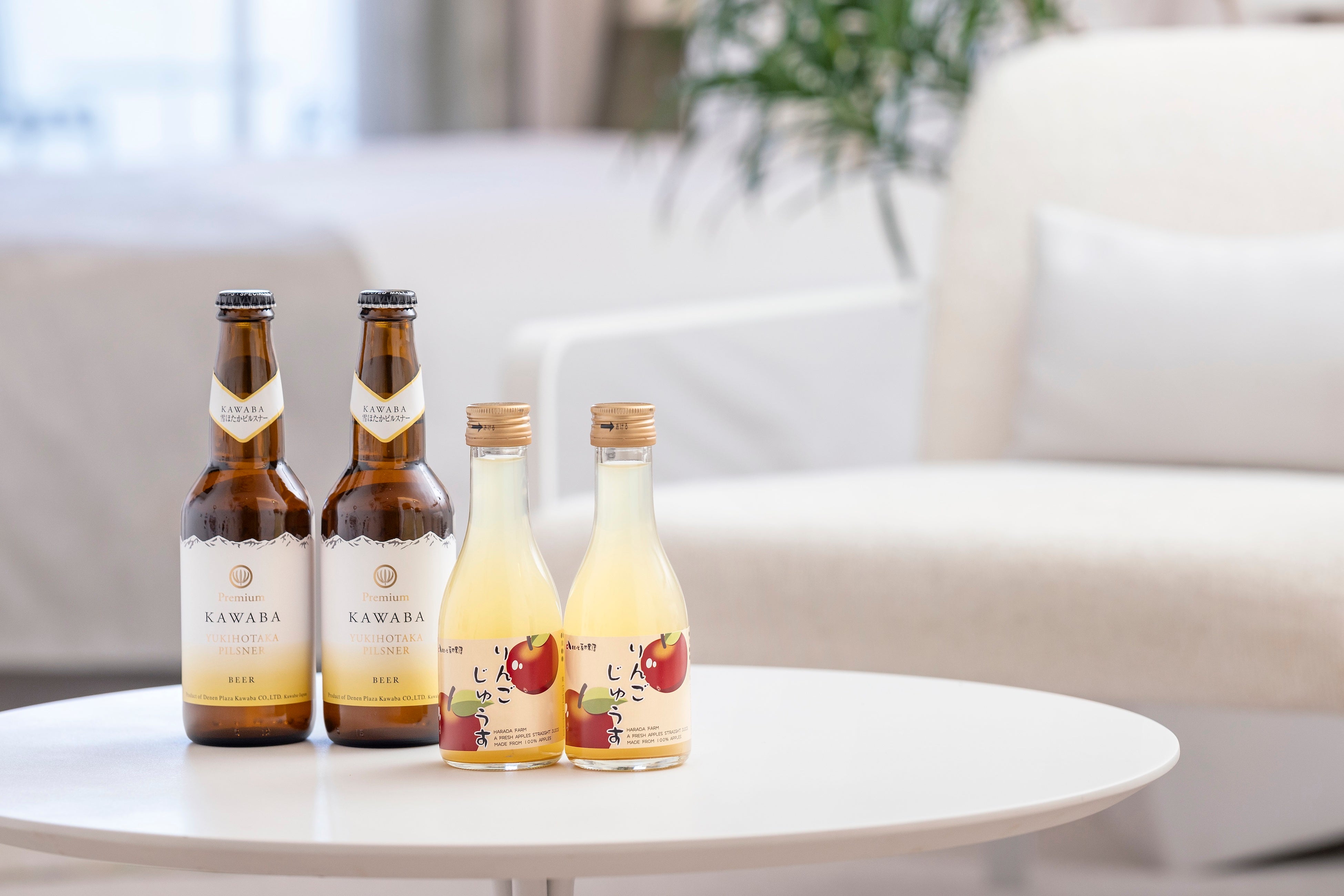 🔸客室内にて群馬産フルーツジュース、クラフトビール、水ならびにザ・パティスリーのオリジナル焼き菓子をご提供。コーヒーも群馬発、ONCA COFFEEの白井屋オリジナルブレンドです。アートに囲まれた客室での贅沢な時間をお過ごしください。