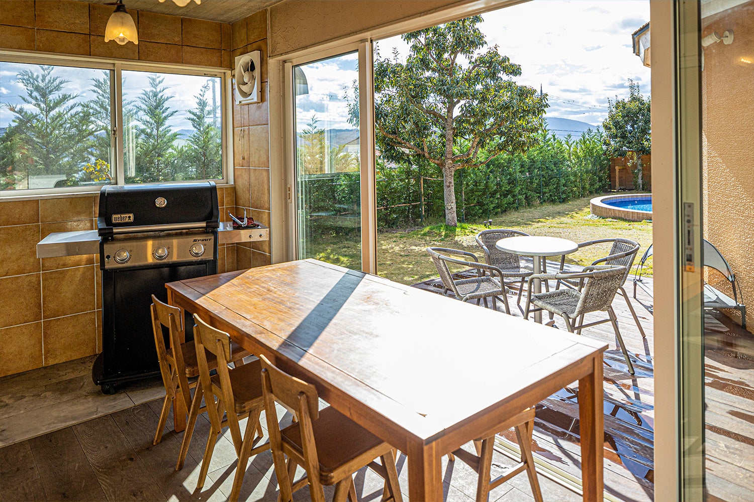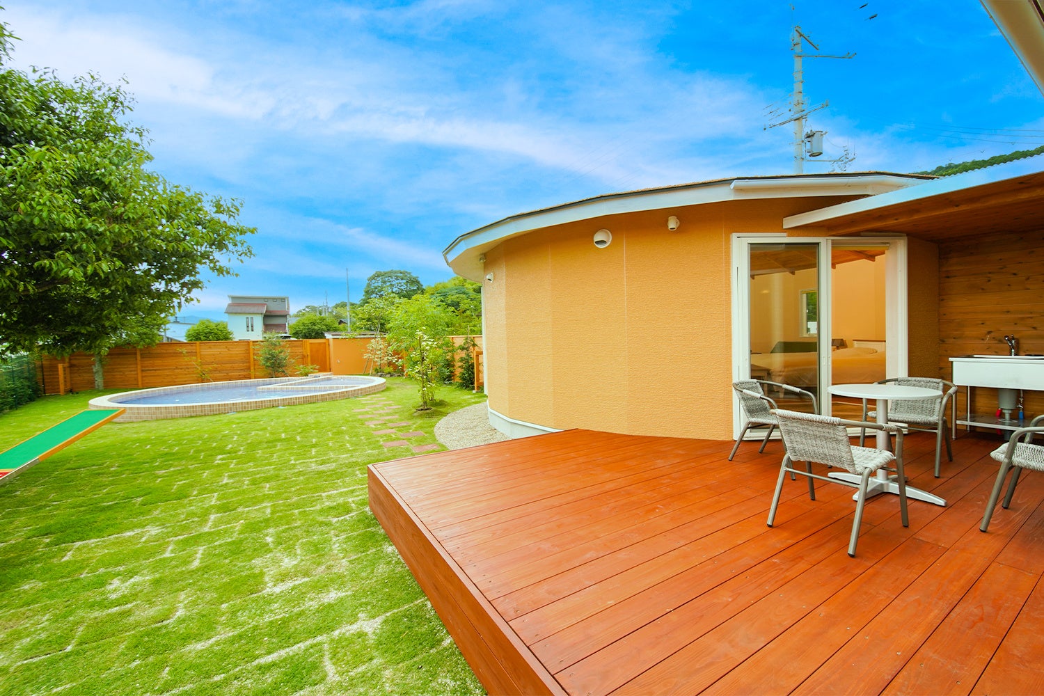 1棟貸切り型の空間には、広々とした贅沢なプライベート空間をひとりじめ。客室温泉とプライベートプールも完備、ワンちゃんにはお庭に専用ドッグランも。