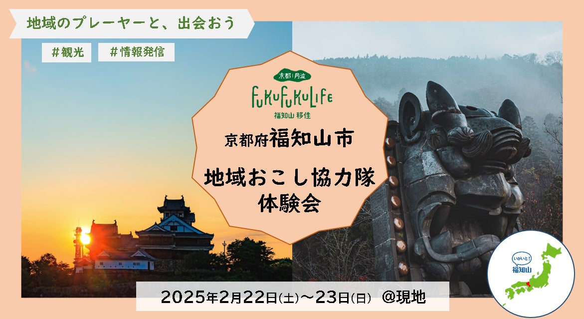 今回の体験会では、一般社団法人京都府北部地域連携都市圏振興社 福知山地域本部(福知山観光協会)が受入候補団体となり、「観光情報の発信」をテーマに行います。観光分野における隊員希望者を対象に、本市での暮らしを体感し、福知山観光協会や現役の隊員との交流を図ります。