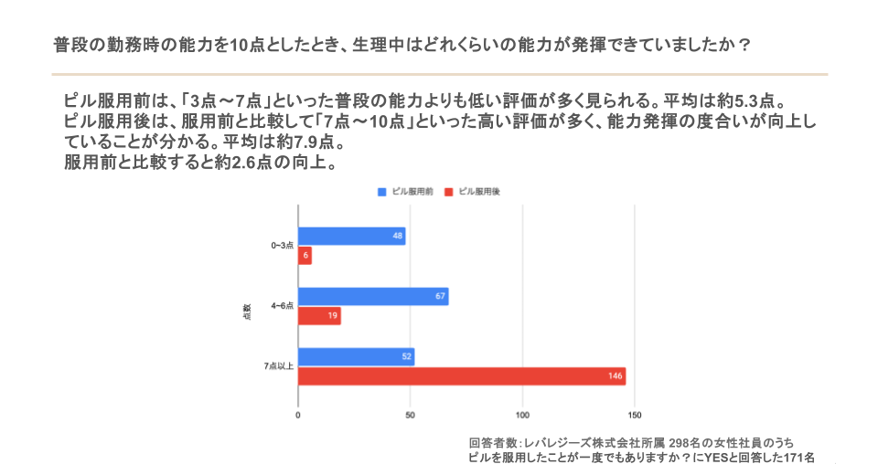 一方で、ピル服用後はパフォーマンスへの影響日数が約1.6日まで減少し、能力発揮も平均7.9点まで向上するなど、改善が見られました。