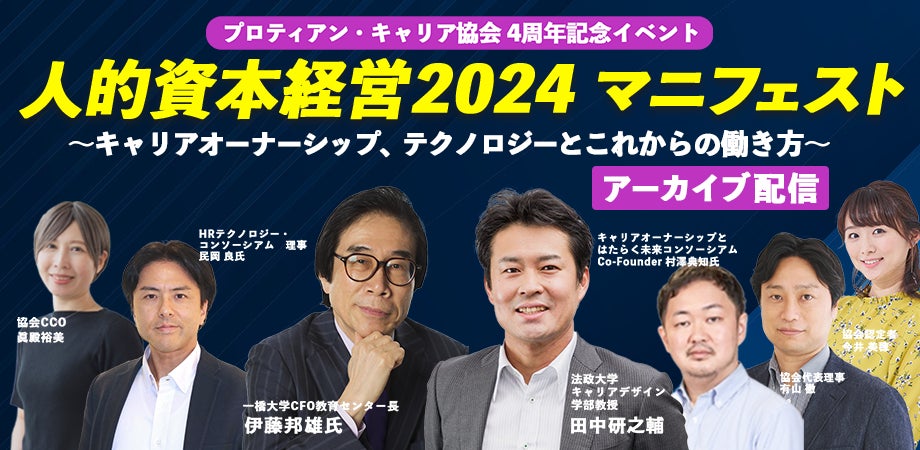一般社団法人プロティアン・キャリア協会(東京都新宿区、代表理事:田中研之輔・有山徹、以下「当協会」)は、組織と個人のより良い関係構築と個人の主体的なキャリア開発を支援する団体です。2020年3月の設立から4周年を記念し、2024年3月2日(土)に「人的資本経営2024マニフェスト~キャリアオーナーシップ、テクノロジーとこれからの働き方~」を開催しました。リアル・オンライン合わせて600名以上が参加した本イベントのアーカイブ配信を開始したことをお知らせいたします。当協会の最高顧問に就任された伊藤邦雄氏にも登壇いただいております。人的資本経営をどのようにとらえ、推進していくのか、個人・人事・経営目線で解説しています。