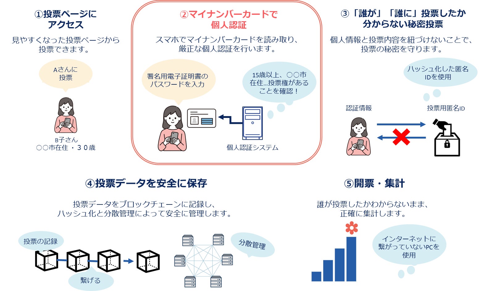 マイナンバーカードの公的個人認証を活用し、時間や場所を問わず「1人1票」を厳格かつ安全に実現するシステムです。ブロックチェーン技術により、投票内容の秘密保持とデータの非改ざん性を高いレベルで担保しています。2018年からのつくば市での実証事業に基づき、自治体や企業等の選挙運営を導入から実施までトータルでサポートします。