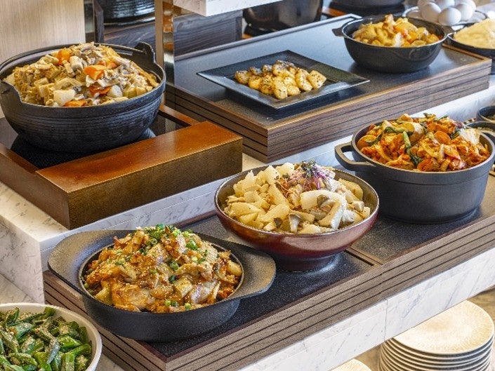朝食ビュッフェでは、平日は一品一品のクオリティにこだわった和食メニューを中心に構成、週末は長野県のご当地メニューを加え、地域の魅力を感じていただける内容へと充実させました。あわせてビュッフェ台も刷新し、レイアウトや演出面を見直すことで、お料理を選ぶひとときもお楽しみいただける空間へと刷新。朝の時間がより豊かで心弾む体験となるよう設計しています。