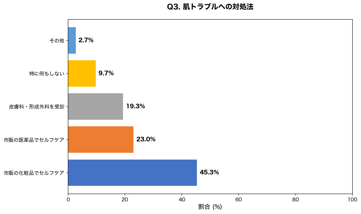 セルフケア(化粧品・医薬品)で対処する人が合計68.3%に上る一方、皮膚科・形成外科を受診する人はわずか19.3%にとどまりました。多くの人が専門的な診断を受けずに症状を放置している実態が明らかになりました。