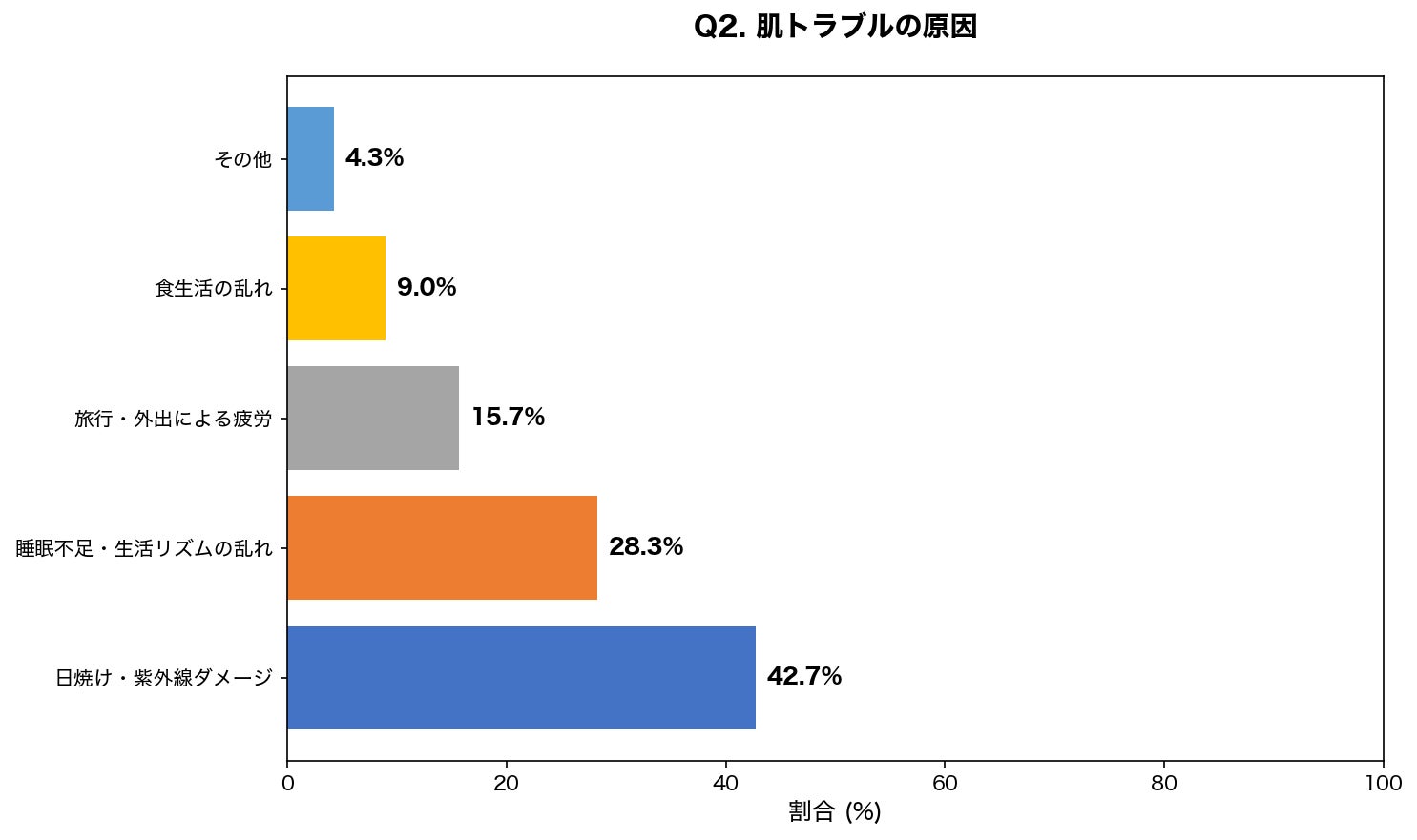 日焼け・紫外線ダメージが最多の42.7%を占め、次いで睡眠不足・生活リズムの乱れが28.3%となりました。GWは屋外活動が増える一方で夜更かしも多くなるため、紫外線と生活習慣の両面から肌がダメージを受けていることがわかります。