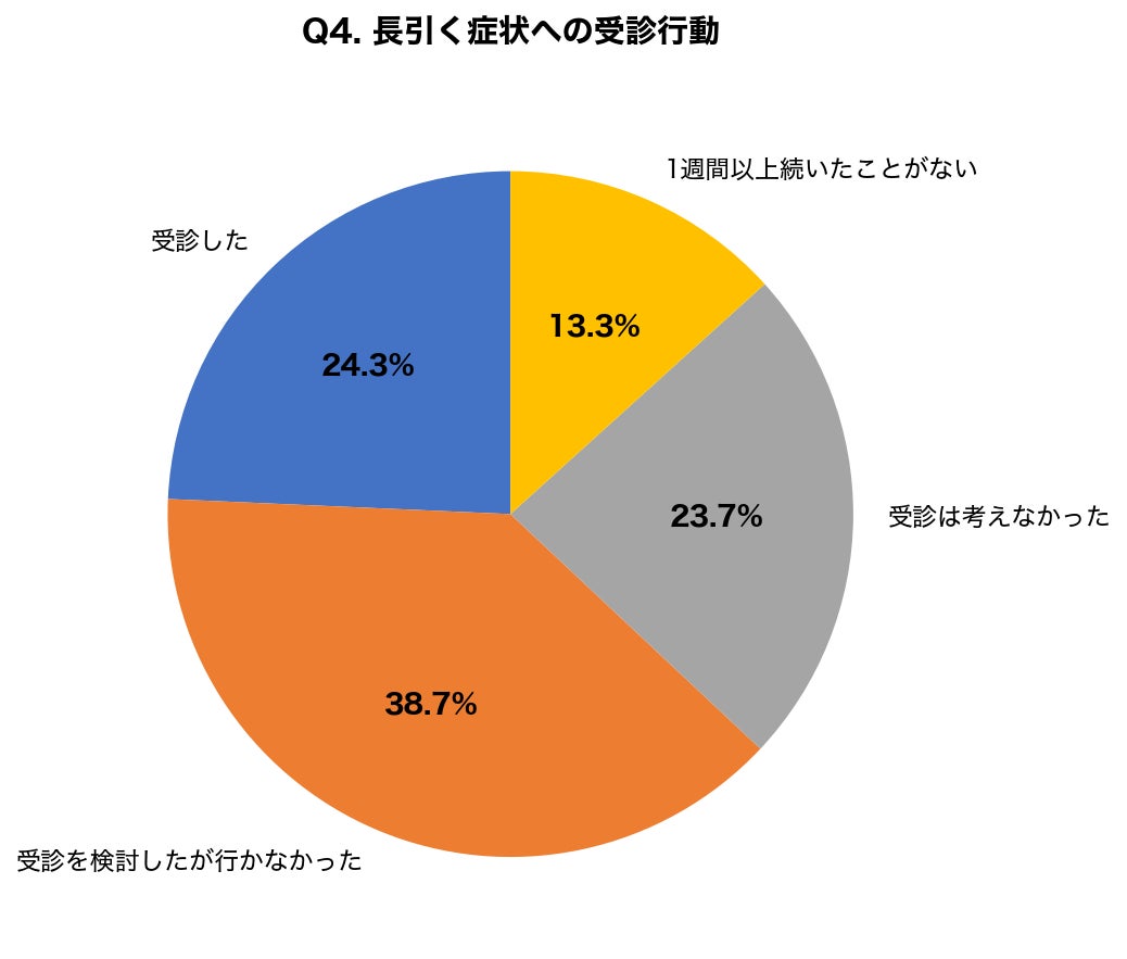 症状が1週間以上続いても受診しなかった人(「検討したが行かなかった」+「考えなかった」)が62.4%に達しました。「忙しい」「自然に治ると思った」といった理由で受診を先延ばしにすることで、症状が慢性化するリスクが懸念されます。