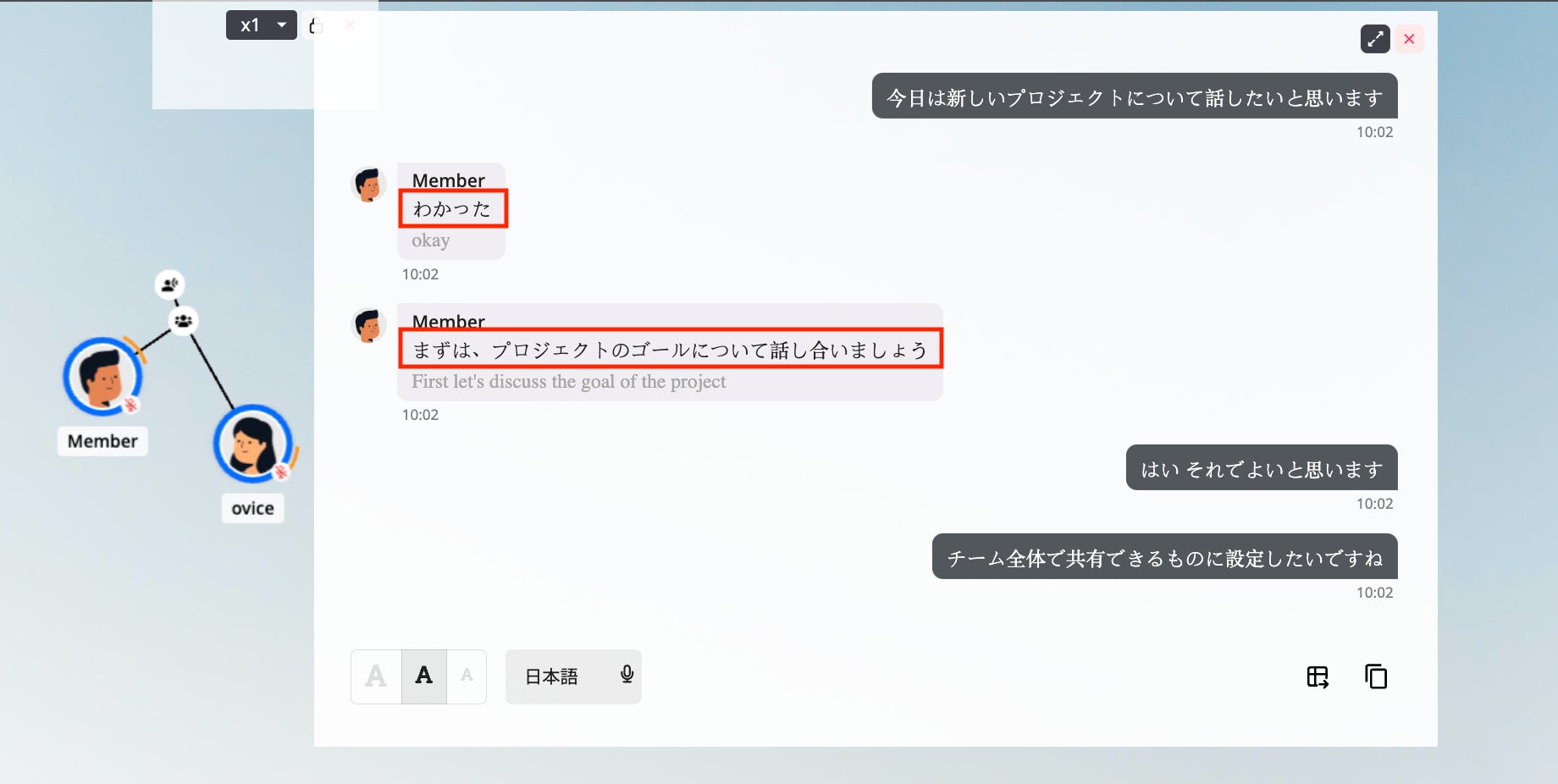 ▲文字起こしオブジェクトで同時翻訳を介して会話している様子