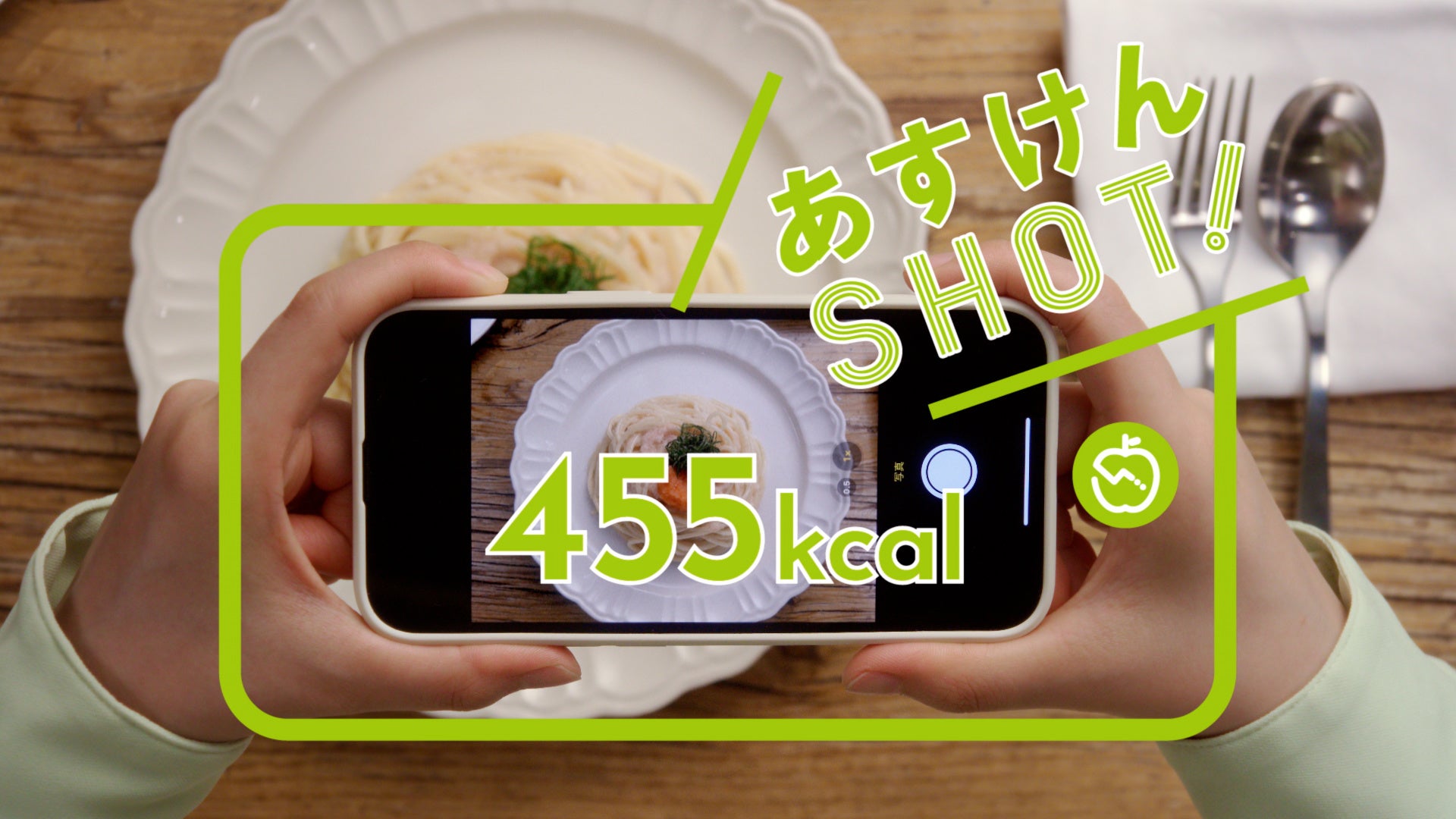 スマートフォンのカメラを使う「AI画像解析機能」やバーコード読み取り機能を「あすけんSHOT」と表現し、簡単に食事記録ができる様子を訴求するCMクリエイティブとなりました。