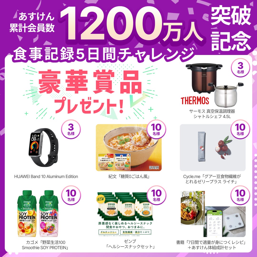 累計会員数1,200万人突破を記念し、『あすけん』アプリではお客様への感謝を込めて「1200万人突破記念♪食事記録5日間チャレンジ(以下本チャレンジ)」を開催します。本チャレンジでは、期間中に5日間の食事記録を行った方の中から抽選で、食生活の改善や健康管理をサポートするアイテムをプレゼントします。