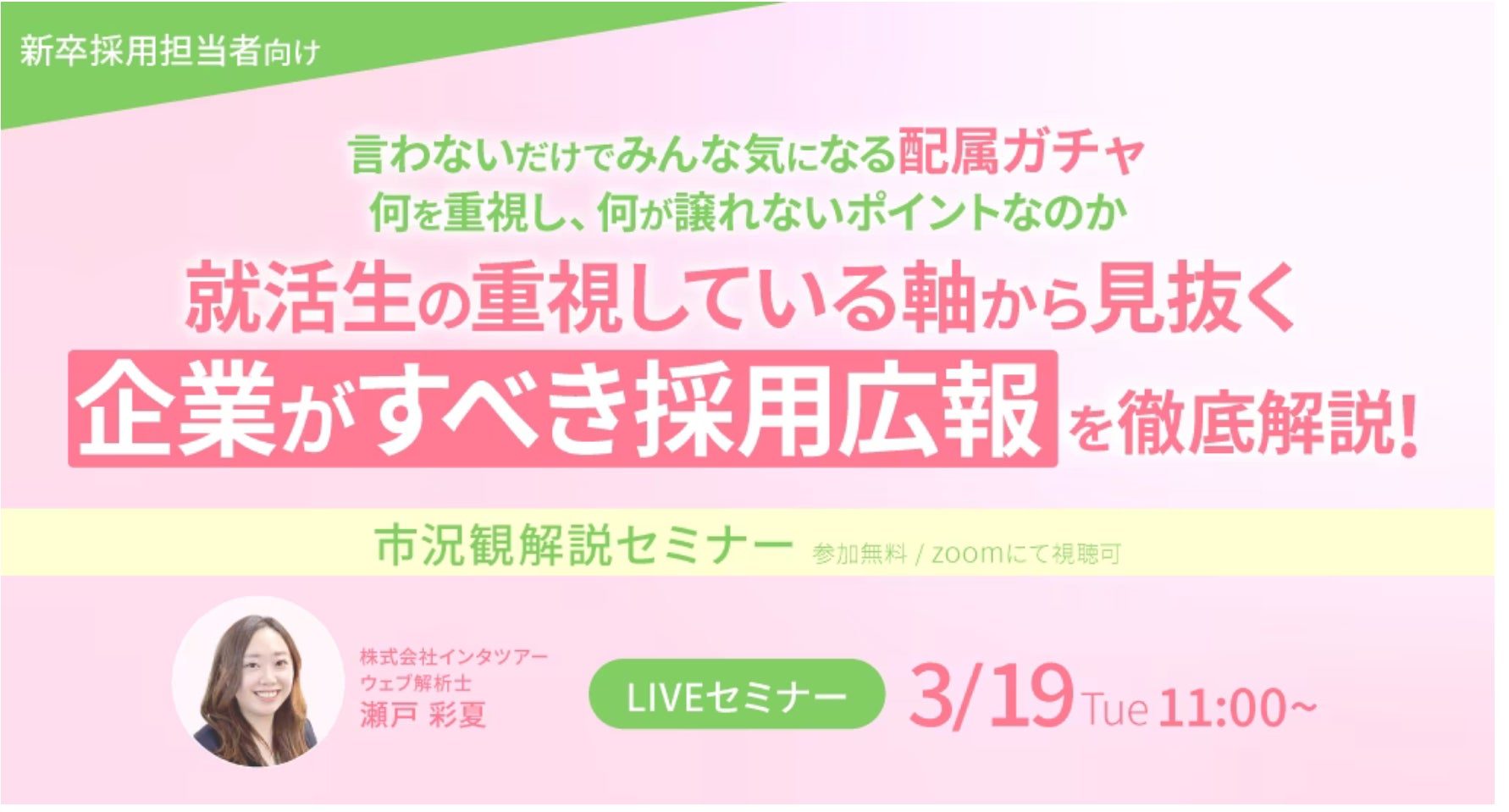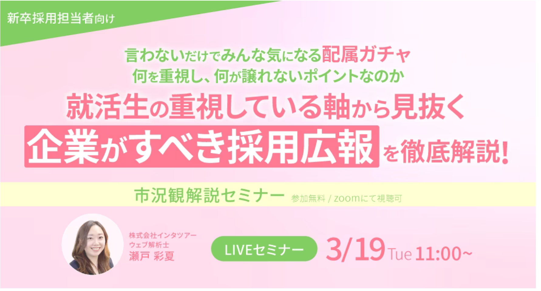 【新卒採用担当者向け】就活生が重視するポイントとは?トレンドに合わせた採用広報/採用戦略をセミナーで解説|インタツアー(キャムコムグループ)