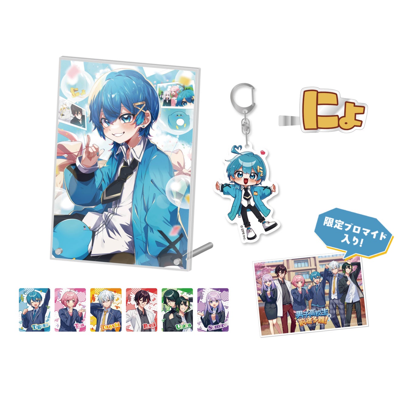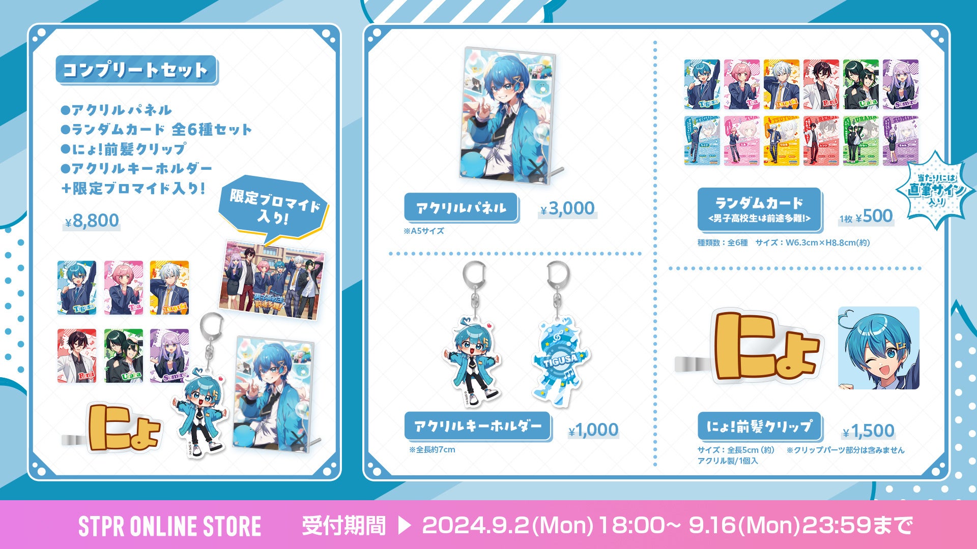 ラインナップは、「アクリルパネル」「アクリルキーホルダー」「ランダムカード」「にょ!前髪クリップ」の全4種。さらに、限定ブロマイド付きの「コンプリートセット」もご用意いたしました。
