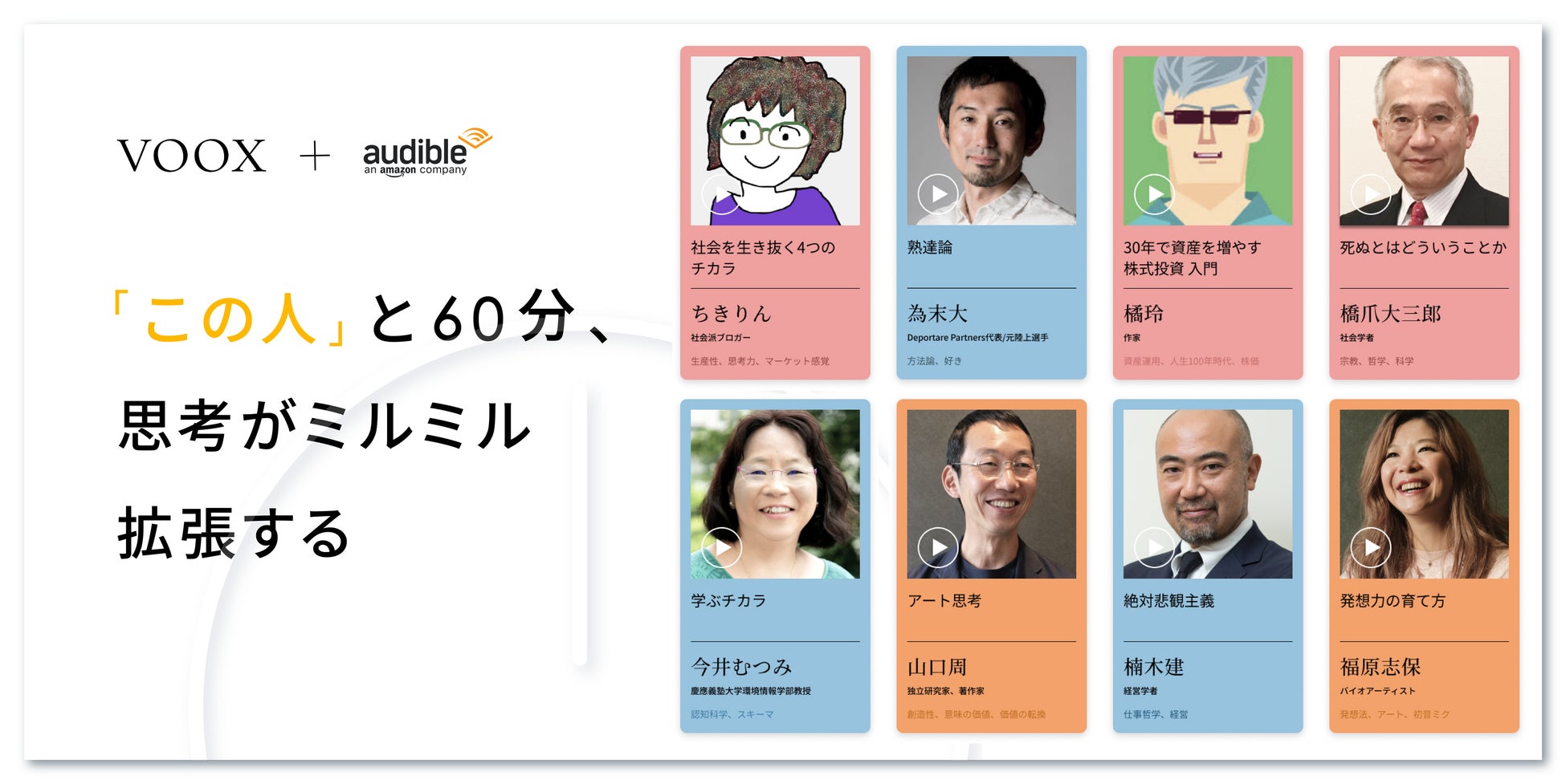 この度の連携では、VOOXでも人気の高い30コンテンツを配信いたします。「Audible」ユーザーに、VOOXの「知識人の実践知を集めた音声教養コンテンツ」を届けることで、より幅広く質の高い学びの機会を提供してまいります。