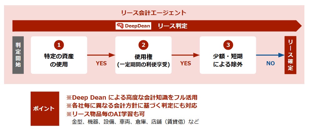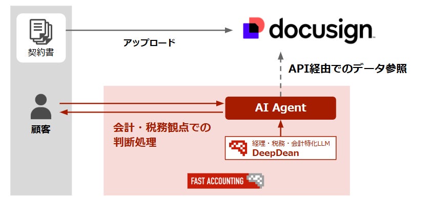 ドキュサインの契約書の一元管理と電子署名による効率的な締結を実現する電子契約サービスと、ファーストアカウンティングの経理シンギュラリティAI「Deep Dean」を内蔵した「経理AIエージェント」を連携、リース契約書のデジタルデータから新基準でリースと判断されるかの判定を自動的に実施します。この連携により、契約書の読取と判定、保管までを一気通貫で自動化することができ、企業のリース会計業務の抜本的な効率化とリスク低減に貢献します。