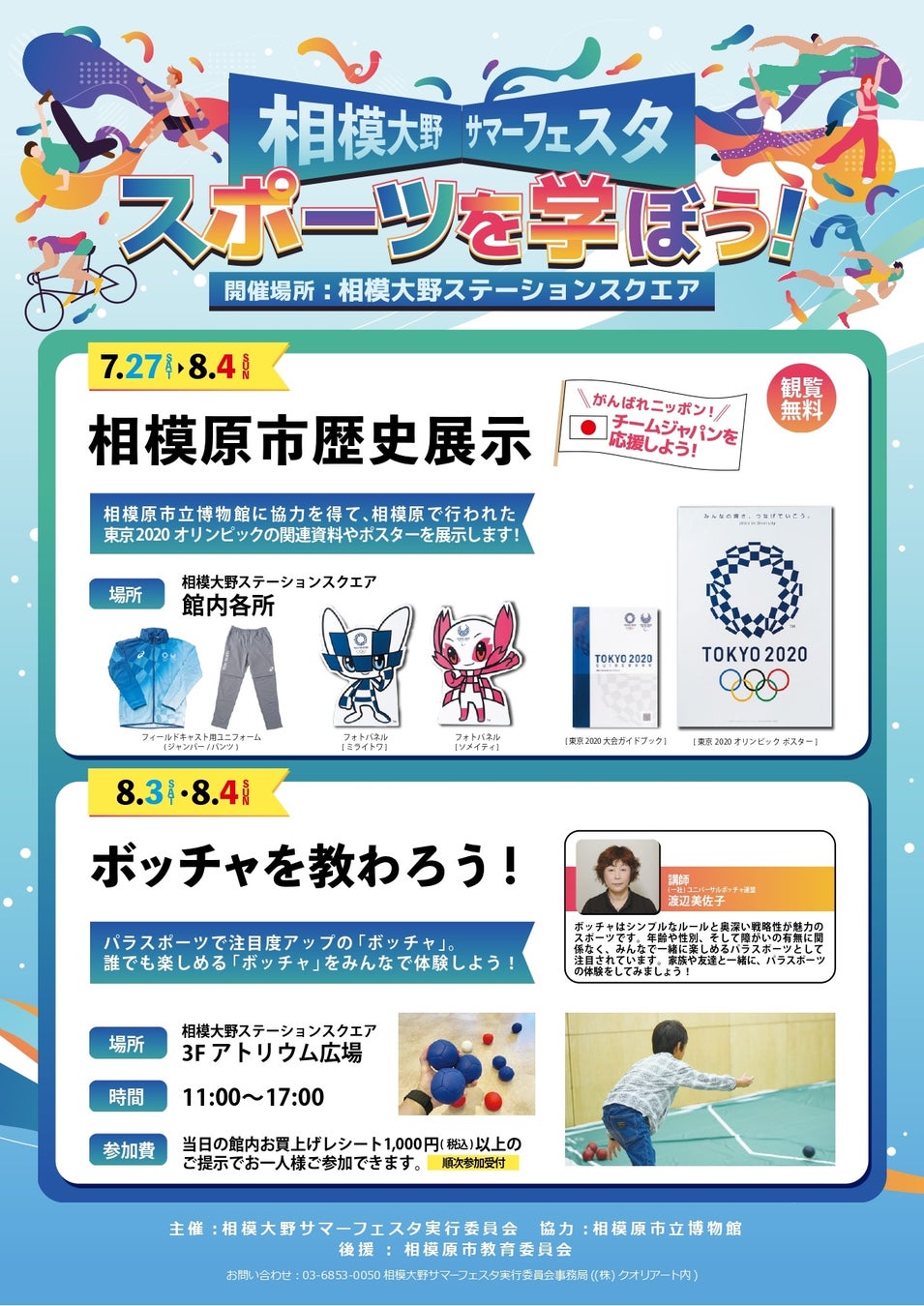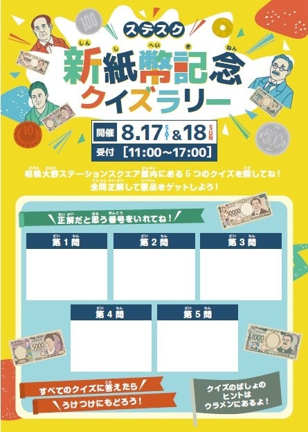 本イベントでは、地元相模原市に立地する北里大学創設者の北里 柴三郎氏が、2024年7月から発行が開始された新千円札紙幣の肖像画となったことを記念した「北里柴三郎を知り・お金を知る ステスクキッズマネースクール」や「新紙幣記念クイズラリー」を8月17日(土)、18日(日)に実施するほか、パラスポーツ「ボッチャ」の体験会、相模原市の魅力を知っていただくイベントなどをご用意。そのほか、夏休みの自由研究にぴったりな館内店舗によるワークショップ(スケートボード超初心者体験会(ムラサキスポーツ)、オリジナル巾着を作ろう!(無印良品))など、相模原市や館内店舗とも連携し、「お金」や「スポーツ」、「地元相模原」、「商業施設のおしごと」などの様々なテーマで、商業施設で楽しみながら学べる機会をご用意しました。