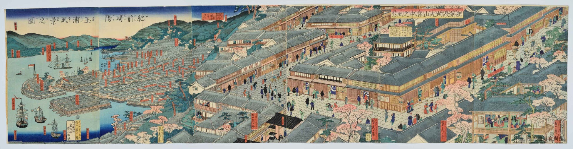 この資料を描いた五雲亭貞秀は横浜でも多くの浮世絵を描いた人物です。本資料は右側に長崎の遊廓街(丸山遊廓)を、左手に長崎の町と出島を描いています。見ごたえのある貞秀の名品です。遊廓は長崎でも横浜でも名所となりました。
