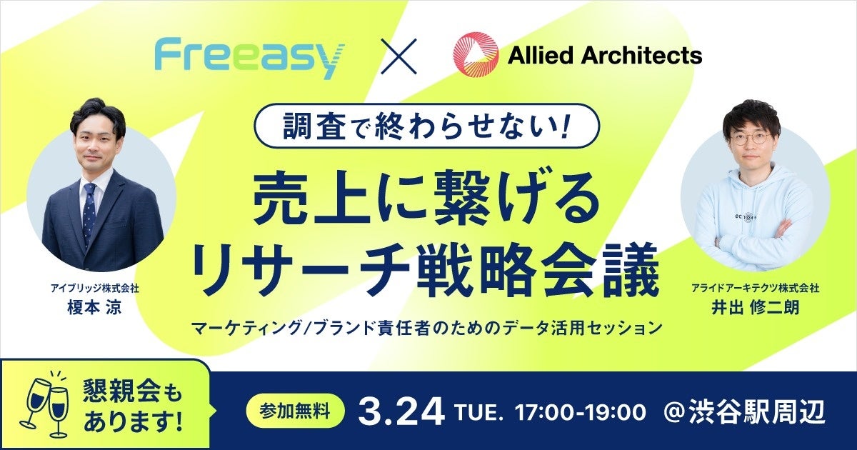 年間3万件以上の調査実績を誇る、国内最大級のセルフ型アンケートツール「Freeasy(フリージー)」を展開するアイブリッジ株式会社(本社:大阪市福島区、代表取締役社長:荒川和也)は、アライドアーキテクツ株式会社様と共催で、3月24日(火)17時から渋谷にて、オフラインセミナー(会場開催)を実施いたします。