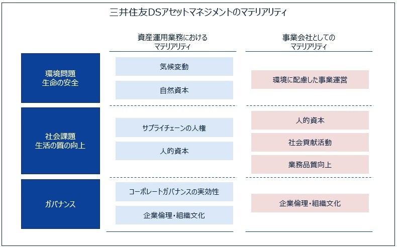当社は、“Quality of Lifeに貢献する最高の資産運用会社へ。”を経営理念に掲げ、お客さまへの質の高い資産運用サービスの提供とともに、インベストメント・チェーンの一翼を担う責任ある機関投資家として投資先企業等に対するスチュワードシップ活動を行っています。こうした取り組みを加速させるために、資産運用業の特性を考慮して「資産運用業務におけるマテリアリティ」と「事業会社としてのマテリアリティ」に区分し、それぞれ「環境問題︓生命の安全」、「社会課題︓生活の質の向上」、「ガバナンス」の3つの分野において多々あるなかから重要度の高い課題を特定しました。