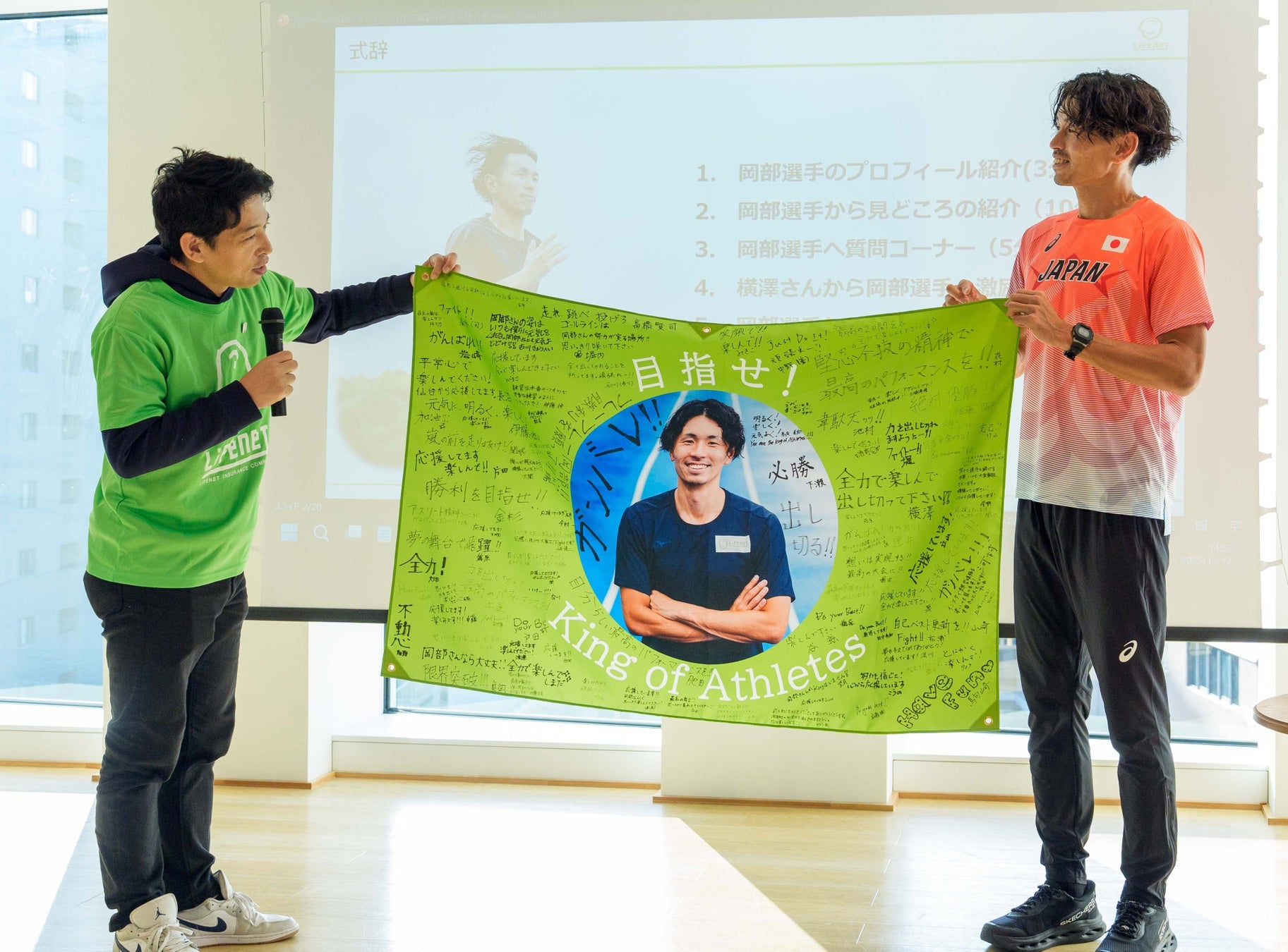 代表取締役社長の横澤は、「35歳から十種競技に挑戦し、世界の舞台に立つまで、岡部さんの努力や成長の過程をずっと見てきました。それが、我々の日頃の仕事への姿勢やモチベーションに大きな影響を与えていると思います。デフリンピック当日は、十種競技の最後の種目である1500mが終わった後、ぜひスタンドを見上げてみてください。岡部さんが笑顔でいられるように、ライフネット生命一同全力で応援します」と激励し、「目指せ!King of Athletes」と書かれた社員からのメッセージが詰まった応援旗を贈呈しました。