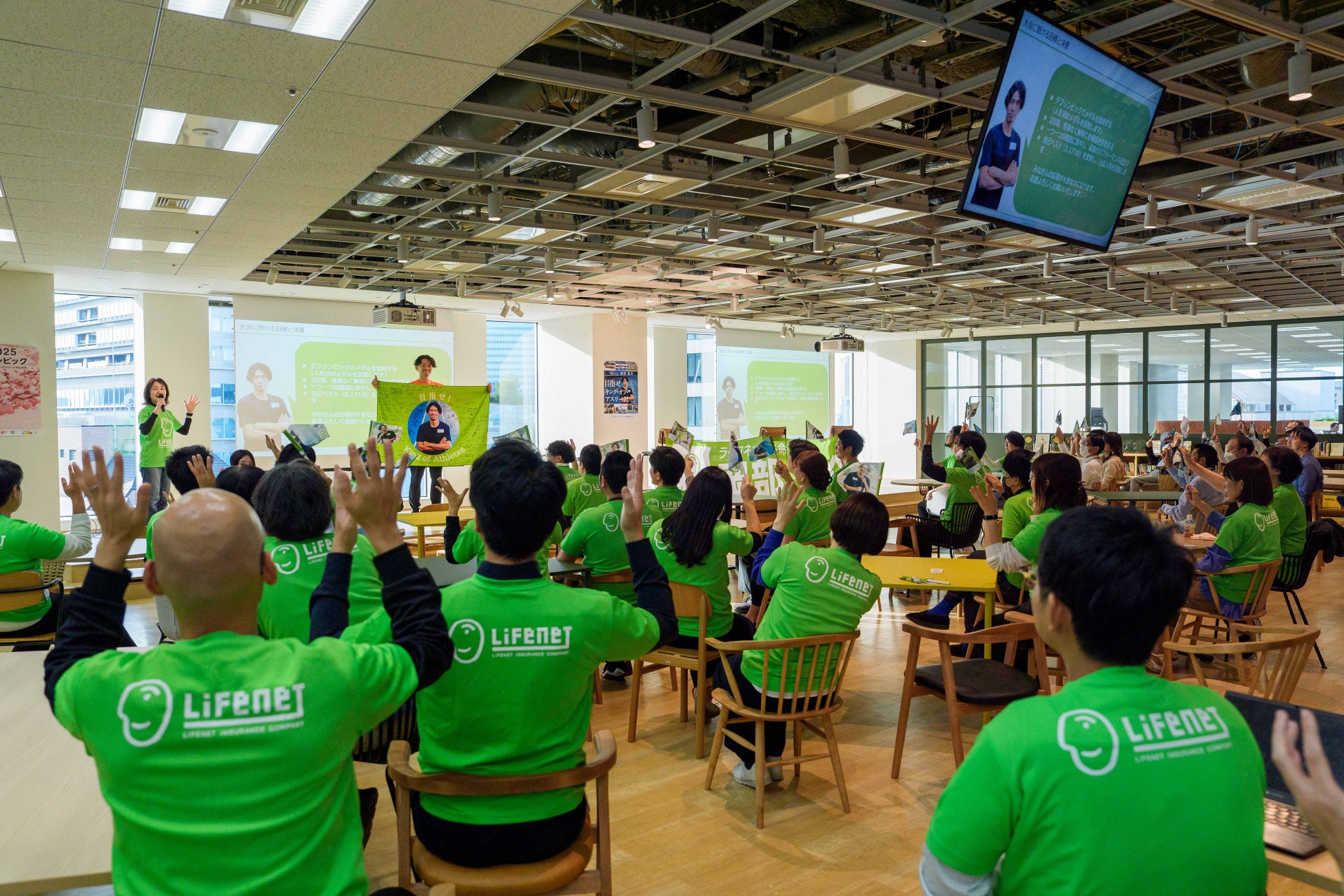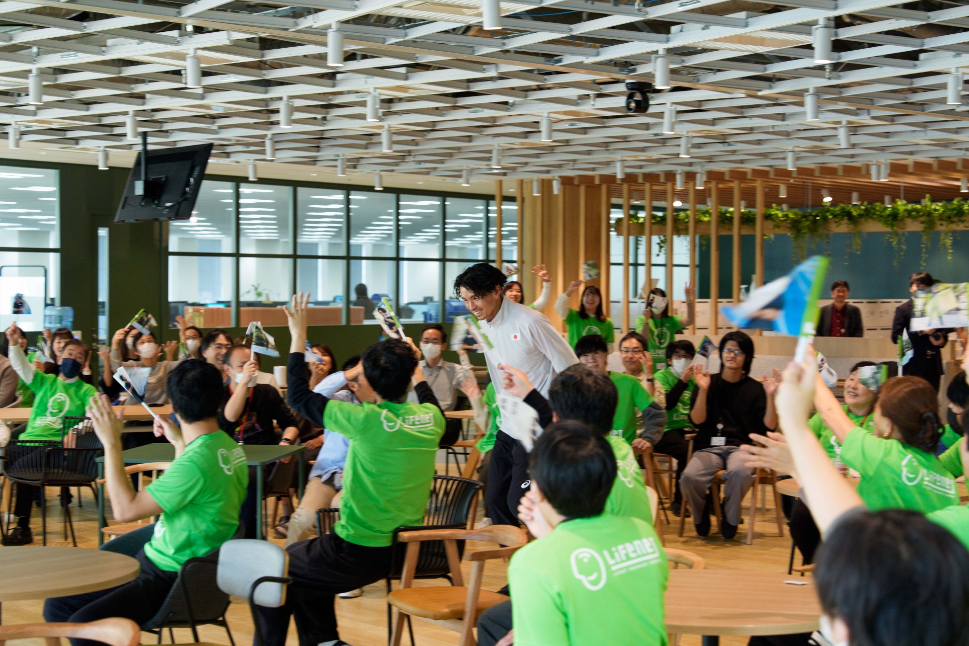 ライフネット生命本社で行った壮行会では、晴れて2025年のデフリンピック日本代表に選ばれ、十種競技では初めての出場となる岡部を、思い思いに旗を振り、手話で拍手を送る社員たちが笑顔で迎えました。