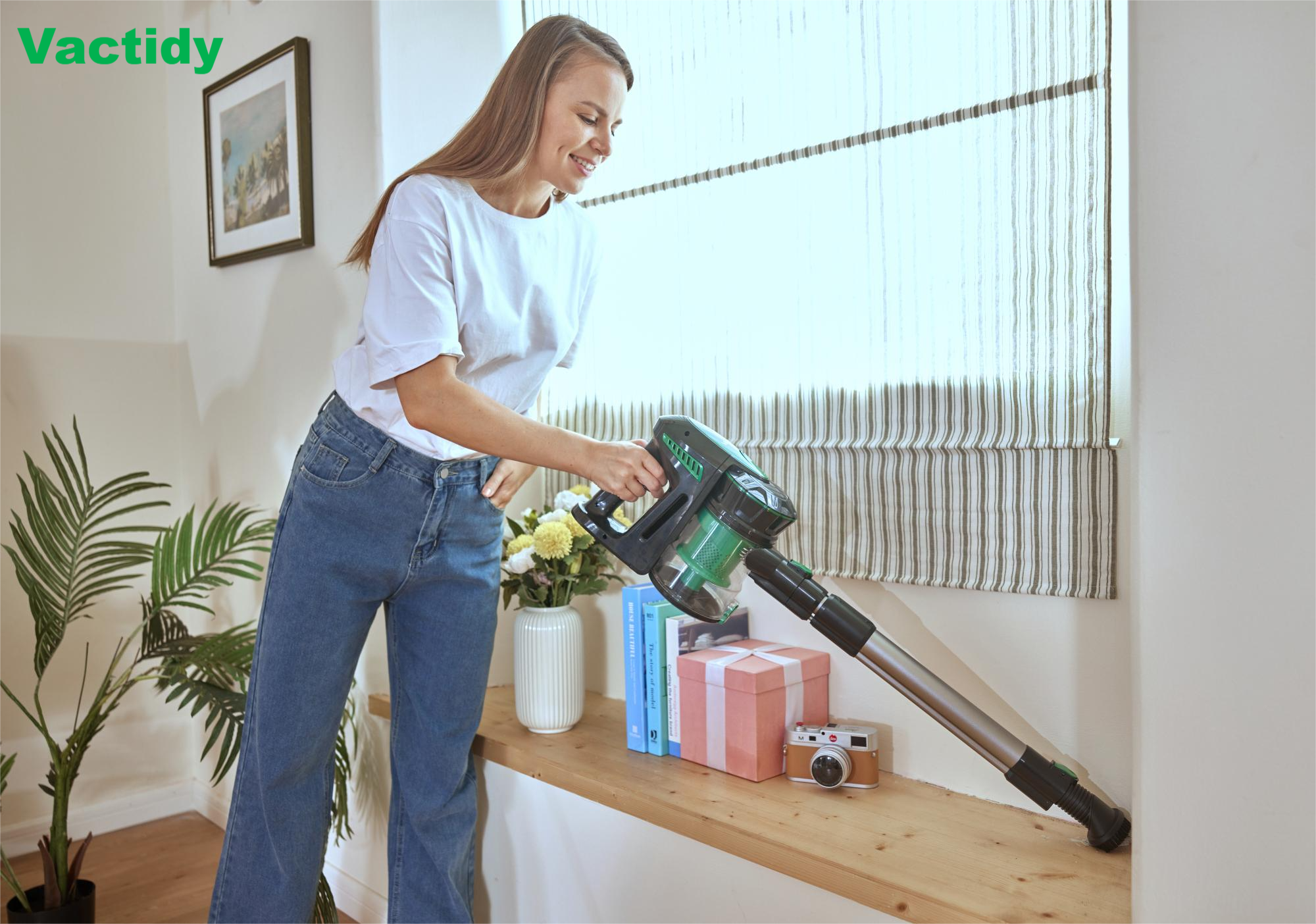 Vactidy V8は、伸縮式デザインで、床や天井などの様々な場所に対応できます。また、独自の強力な吸引力により、カーペット、床、タイル、そして隙間までしっかりと掃除することができます。