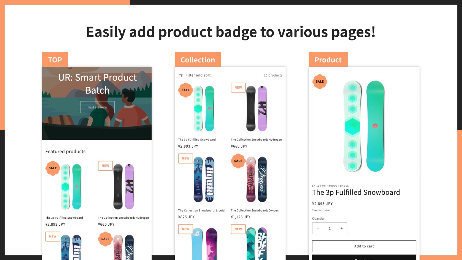 「UR: Smart Product Badge」では、トップページからコレクションページ、商品詳細ページまで、ショップ内のあらゆるページに商品バッジを一括または個別に簡単に追加できます。ターゲットとなるページを自由に選択できるため、より多くのお客様の目に留まる形で商品を際立たせることが可能です。
