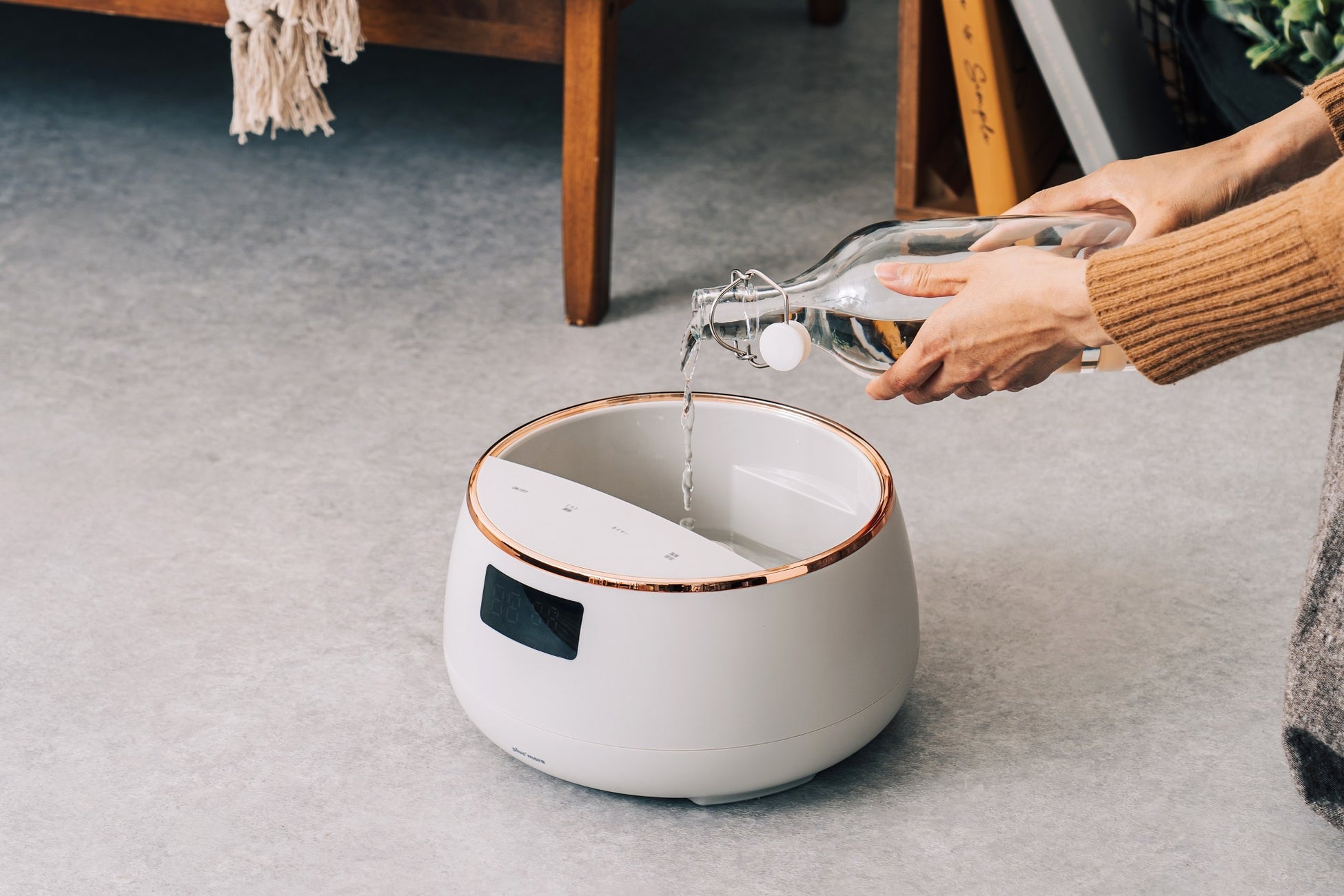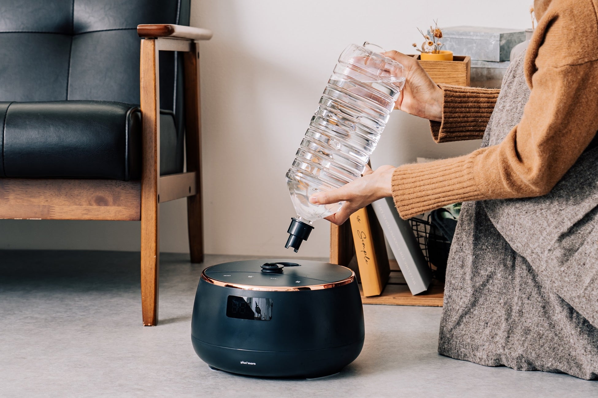 本体タンク容量約1.5Lに2Lペットボトルを差し込むと、最大3.5Lの大容量になる超音波加湿器。湿度コントロールや自動給水機能がつくなど機能性も充実。