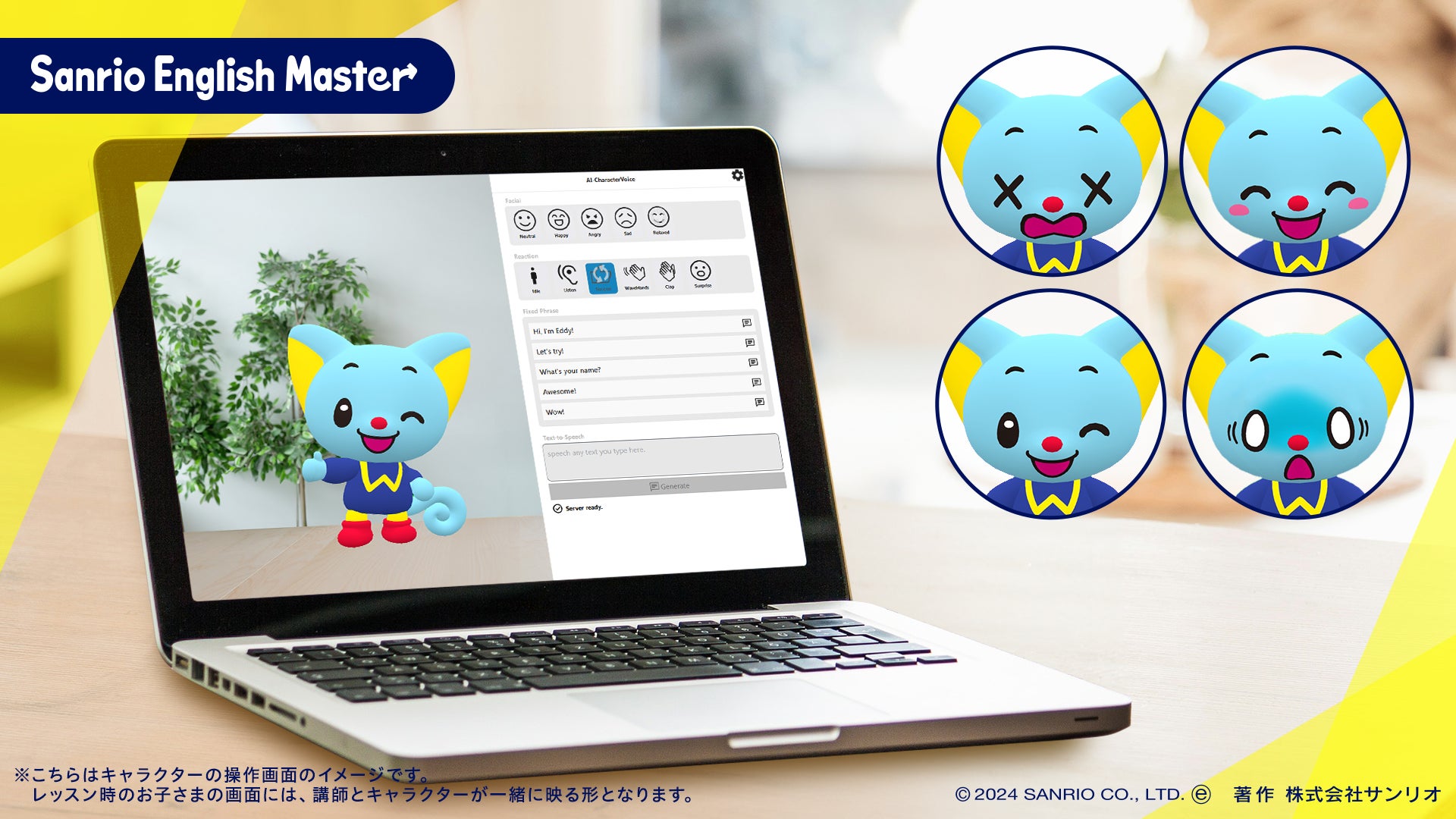本サービスはSanrio English Masterのメインキャラクター「BUDDYEDDY」の声をAI学習し、PCに入力されたテキストにあわせて「BUDDYEDDY」そっくりな発話をできるだけでなく、講師が「BUDDYEDDY」の表情や動きを操作できるようにしています。本サービスをSanrio English Masterのオンラインライブレッスンに導入することで、お子さまが「BUDDYEDDY」と一緒に英会話を楽しむことができるレッスンを実現いたします。
